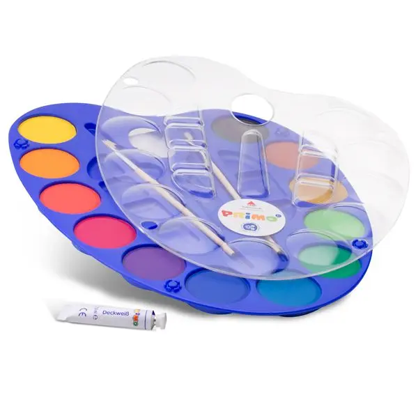 Комплект акварелни боички в пластмасова палитра с капак. Вашата първа истинска акварелна палитра, за да се почувствате като истински художник. Извадете капака, обърнете го и използвайте кръглите ванички, за да създадете собствен цвят.