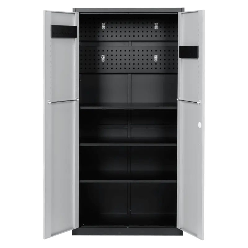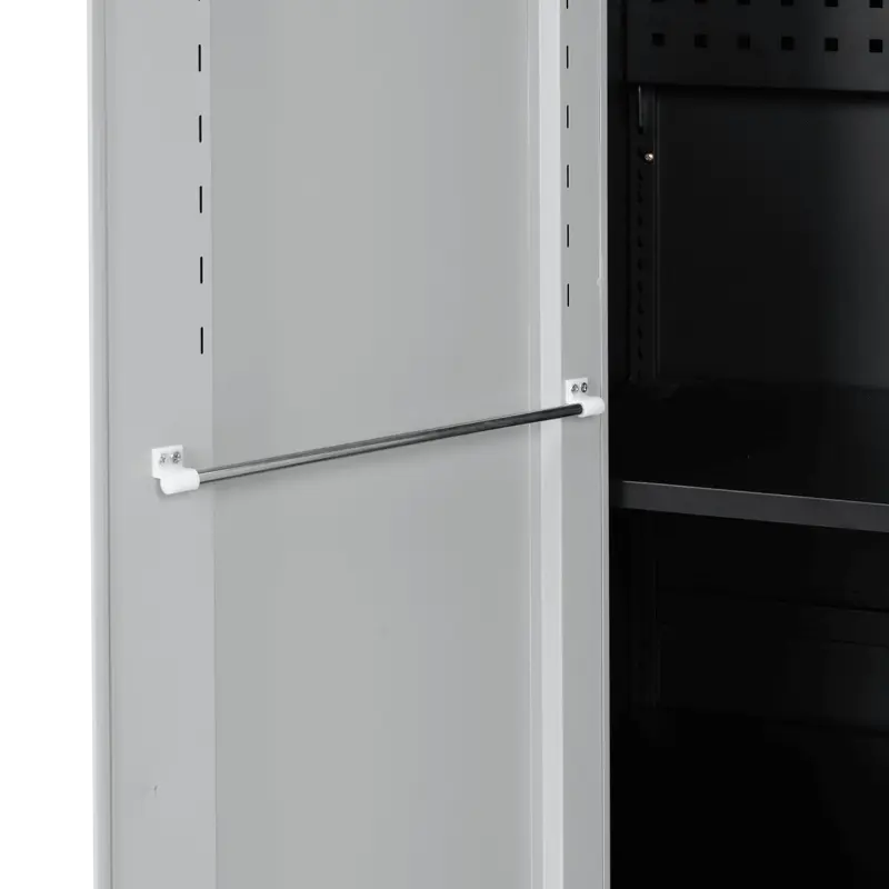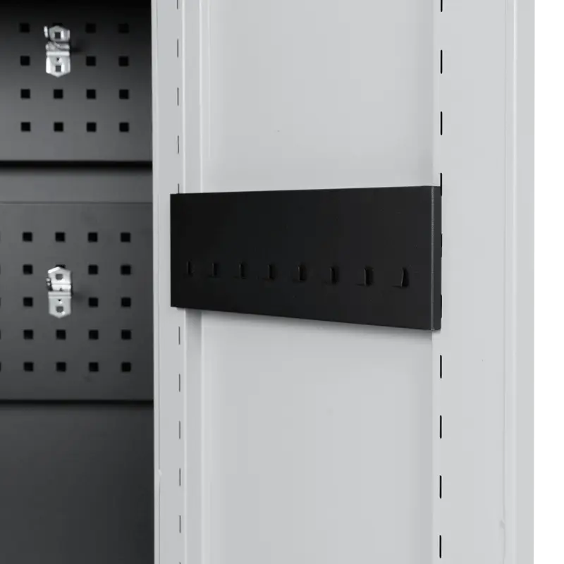 Архивен шкаф BTL LS с 6 отделения 185х90х45 см предлага практично и надеждно решение за подреждане на инструменти в работна среда. Изработен е от прахово боядисан метал и разполага с 3 регулируеми рафта, всеки с товароносимост до 40 кг. От вътрешната страна на вратите има куки за окачване на инструменти и по един лост на всяка врата, подходящ за работни кърпи. Във вътрешното отделение са монтирани още 4 куки, с възможност за добавяне на допълнителни (не са включени в комплекта). Конструкцията позволява лесна организация и бърз достъп до всичко необходимо.