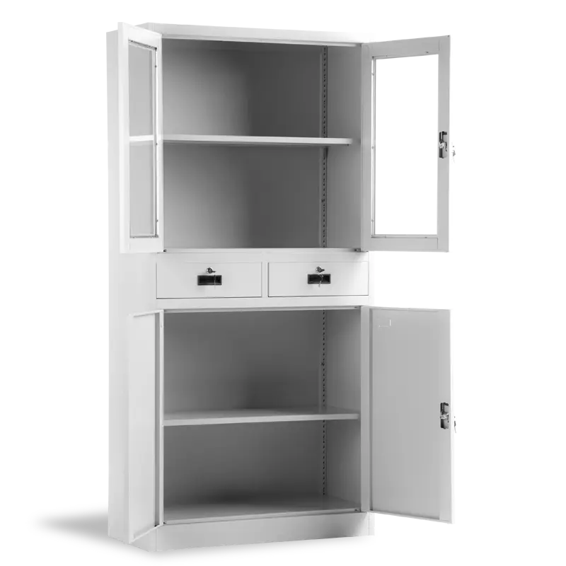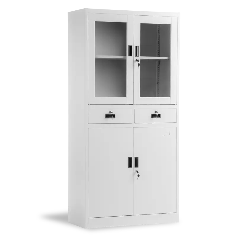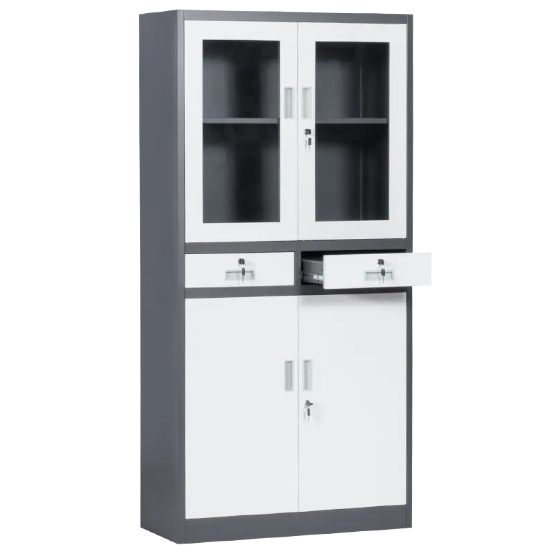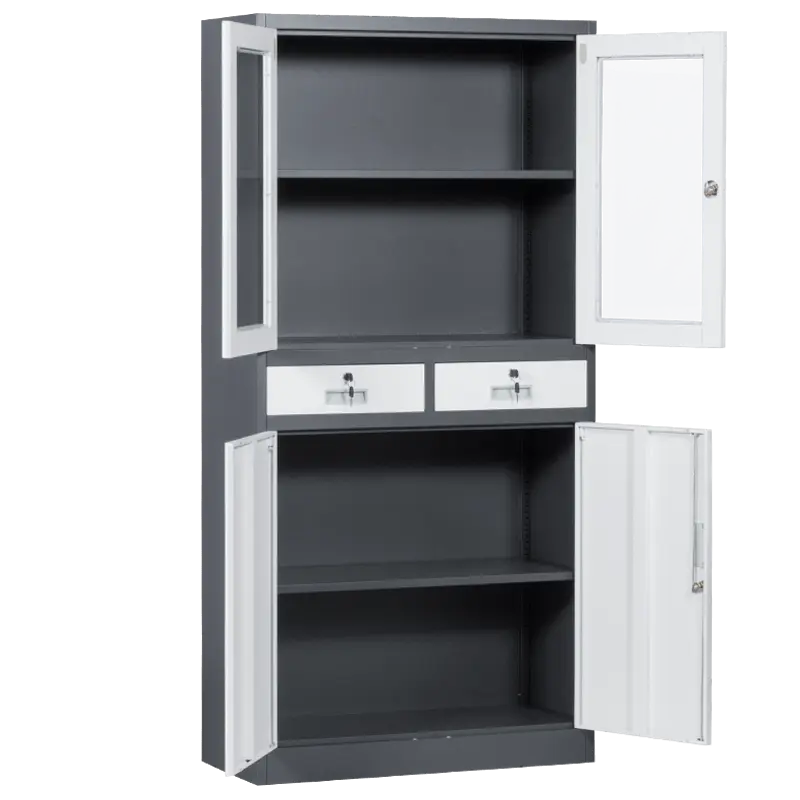 Архивен шкаф BTL LZ с 4 отделения 185х90х40 см за документи е функционално и надеждно решение за съхранение във всеки офис. Той е изработен от праховобоядисан метал с пясъчно покритие, което осигурява здравина и устойчивост. Комбинираните врати съчетават стъклени и плътни панели за удобен достъп и защита на документите. Шкафът разполага с две чекмеджета и два регулируеми рафта с товароносимост до 40 кг на рафт. Вместимостта му достига 48 стандартни класьора формат А4 с широчина 7 см.