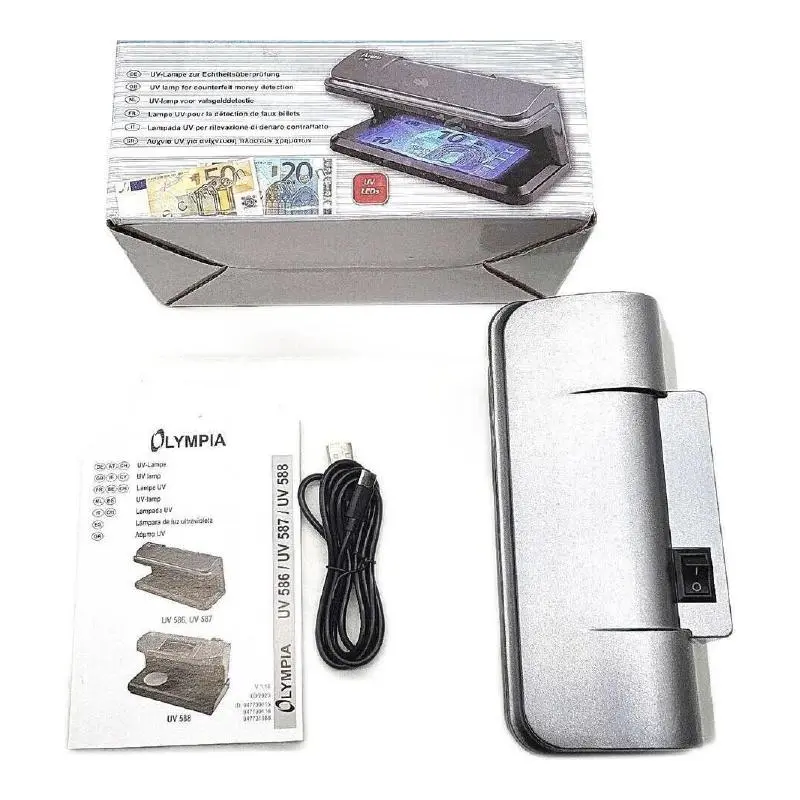 Детектор за фалшиви банкноти Olympia 587 е практично решение за бърза и сигурна проверка на банкноти, кредитни карти и документи с ултравиолетови защити. Благодарение на мощните UV LED светлини с дължина на вълната 365 nm, устройството гарантира надеждно разпознаване на скрити маркировки и защити.