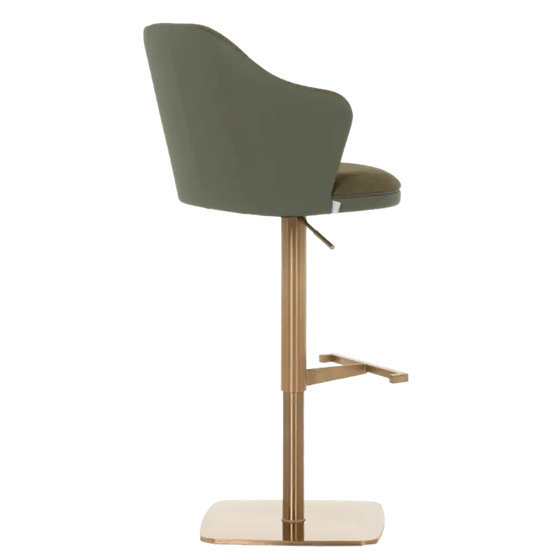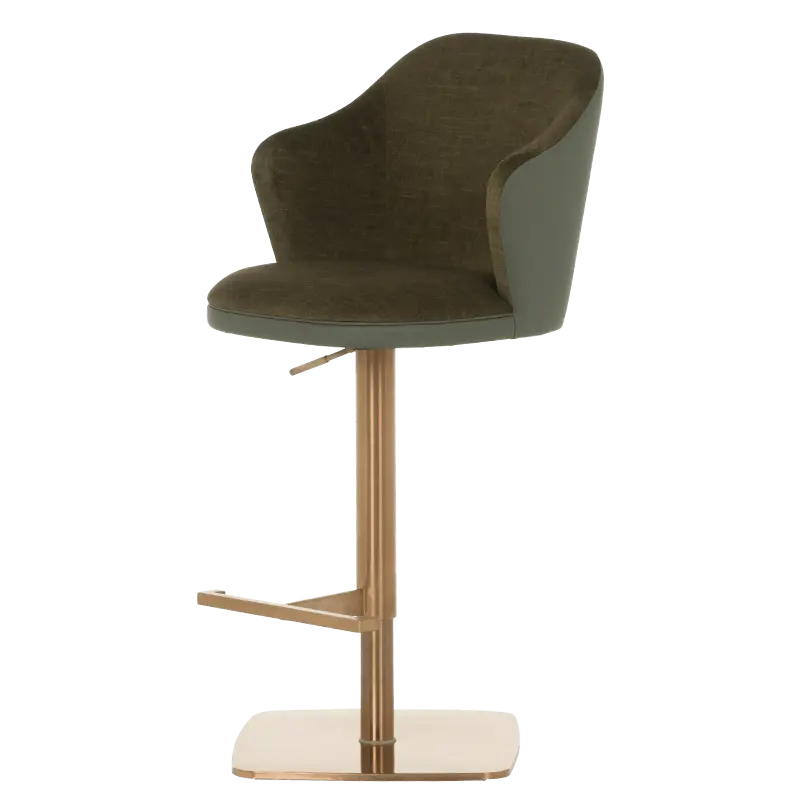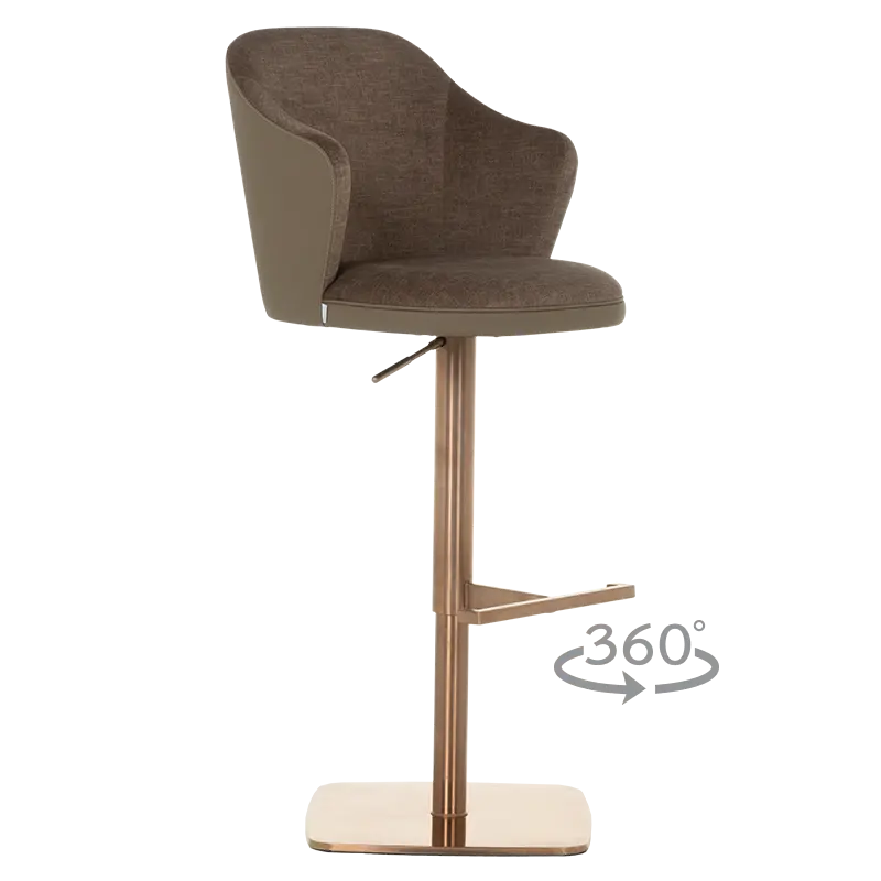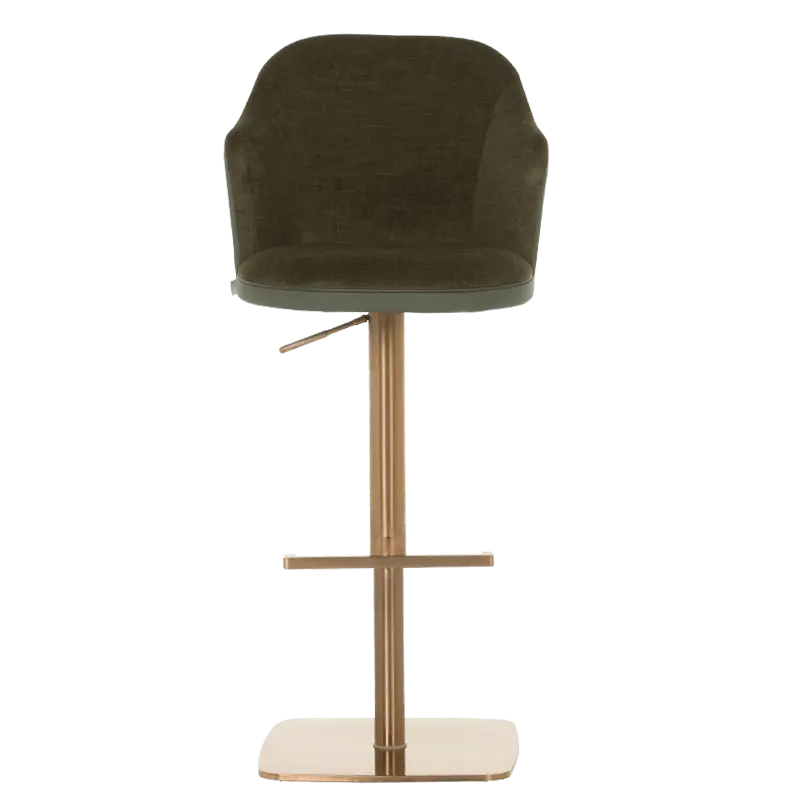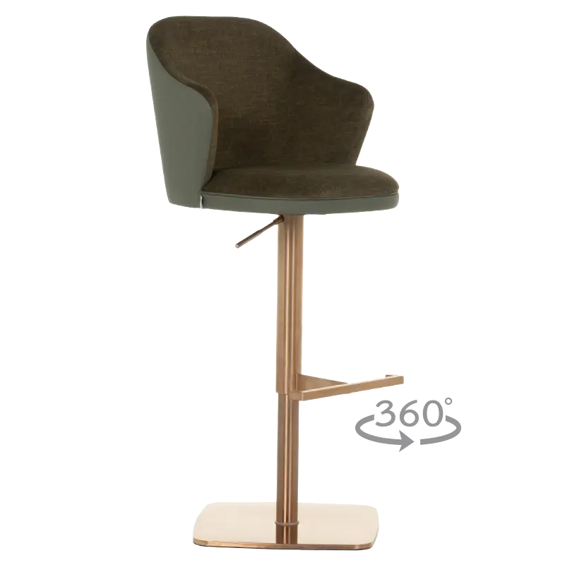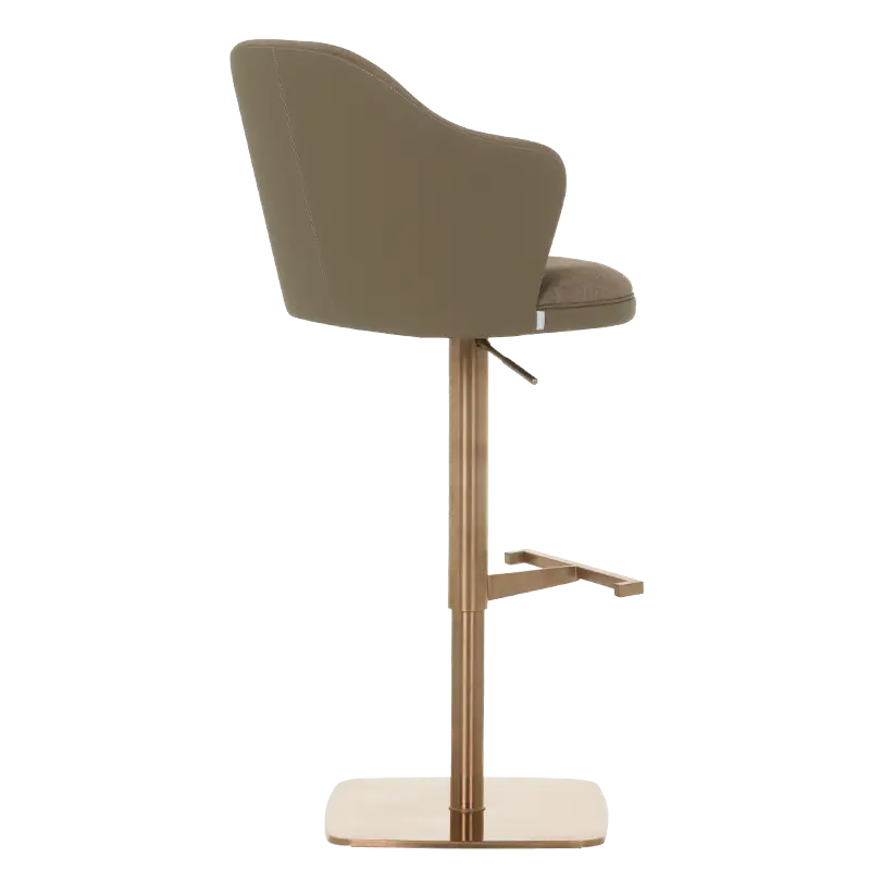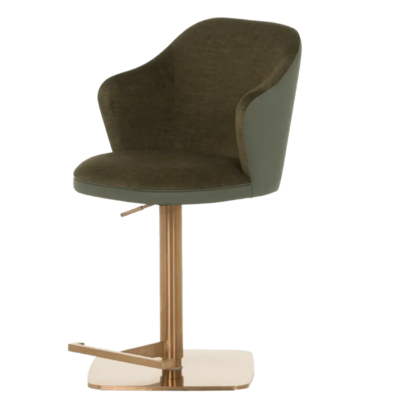 Бар столът БЛАГО е съвършеното въплъщение на лукс и комфорт, съчетавайки модерен дизайн с функционалност. Тапициран във висококачествена еко кожа, той предоставя несравнима мекота и елегантност, създавайки изискана атмосфера. Основата му е изработена от иноксова стомана с луксозно полирано покритие със златист финиш, което придава както забележителна издръжливост, така и изискан блясък. Подлакътниците се преливат плавно с облегалката, създавайки стилна извивка, която подчертава хармоничния и елегантен силует на стола. С въртене на 360 градуса и регулируема височина, бар столът предлага както функционалност, така и изтънчен визуален акцент за всеки интериор, където комфортът и стилът се преплитат в съвършена хармония.