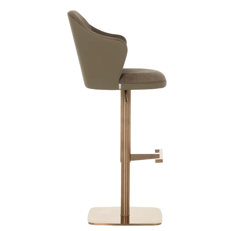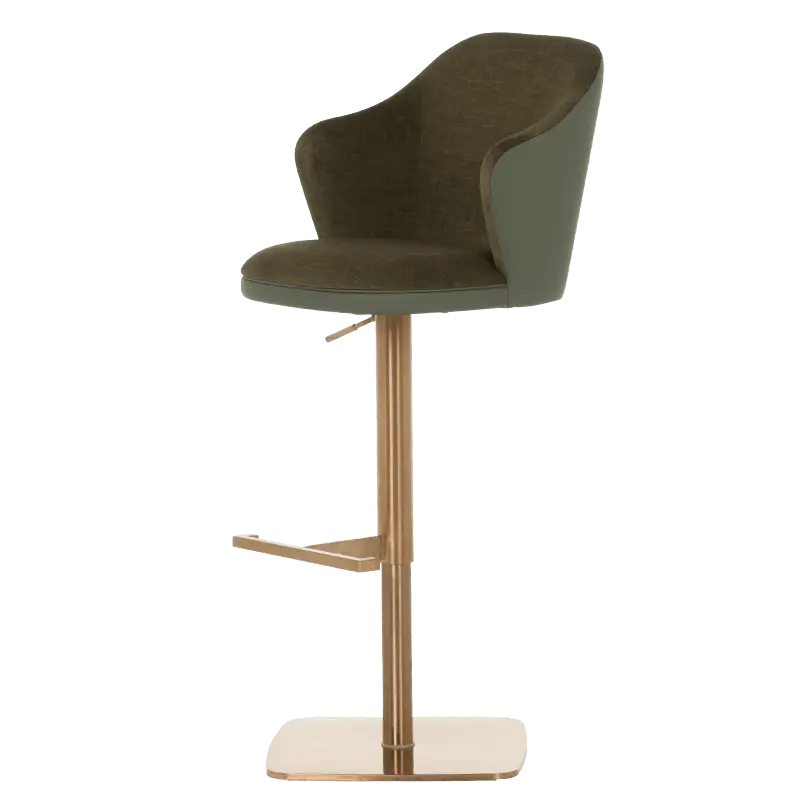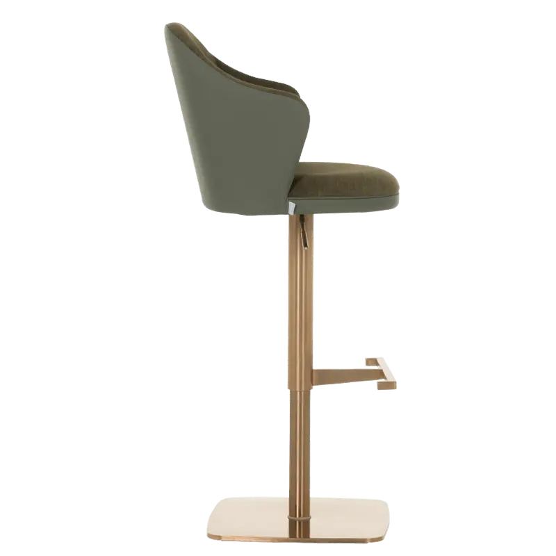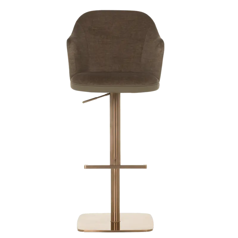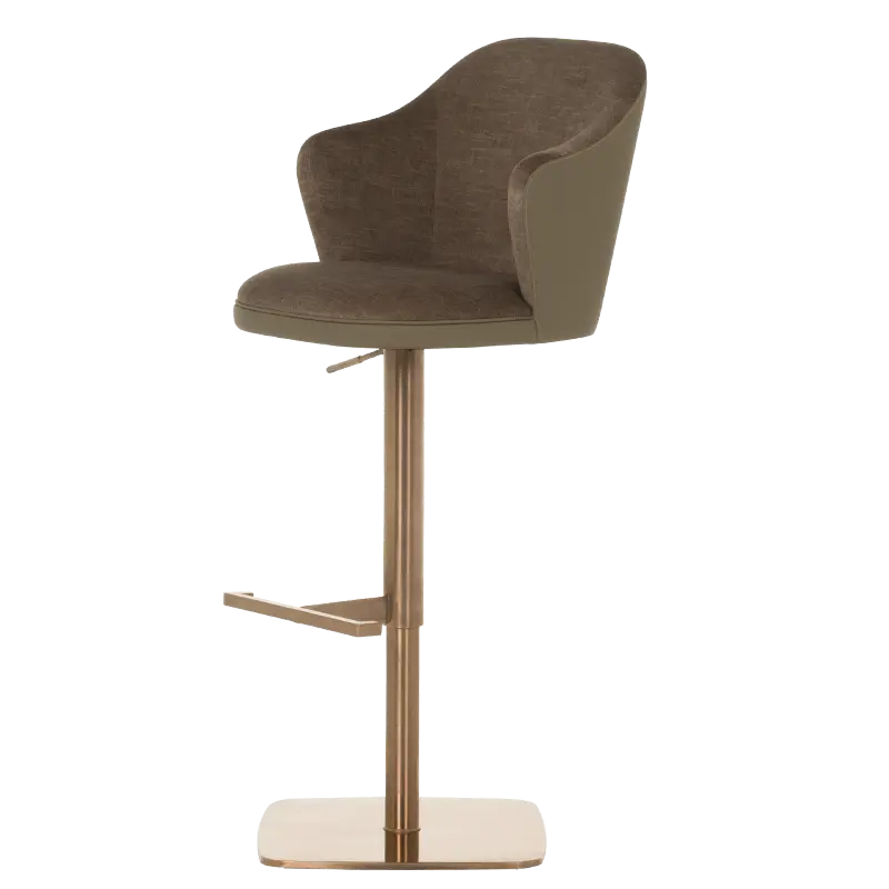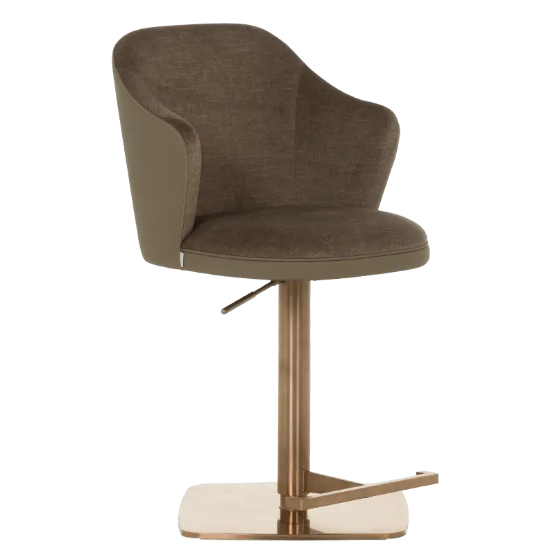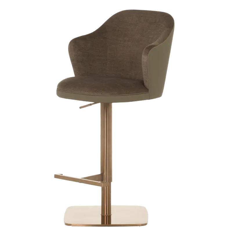 Бар столът БЛАГО е съвършеното въплъщение на лукс и комфорт, съчетавайки модерен дизайн с функционалност. Тапициран във висококачествена еко кожа, той предоставя несравнима мекота и елегантност, създавайки изискана атмосфера. Основата му е изработена от иноксова стомана с луксозно полирано покритие със златист финиш, което придава както забележителна издръжливост, така и изискан блясък. Подлакътниците се преливат плавно с облегалката, създавайки стилна извивка, която подчертава хармоничния и елегантен силует на стола. С въртене на 360 градуса и регулируема височина, бар столът предлага както функционалност, така и изтънчен визуален акцент за всеки интериор, където комфортът и стилът се преплитат в съвършена хармония.