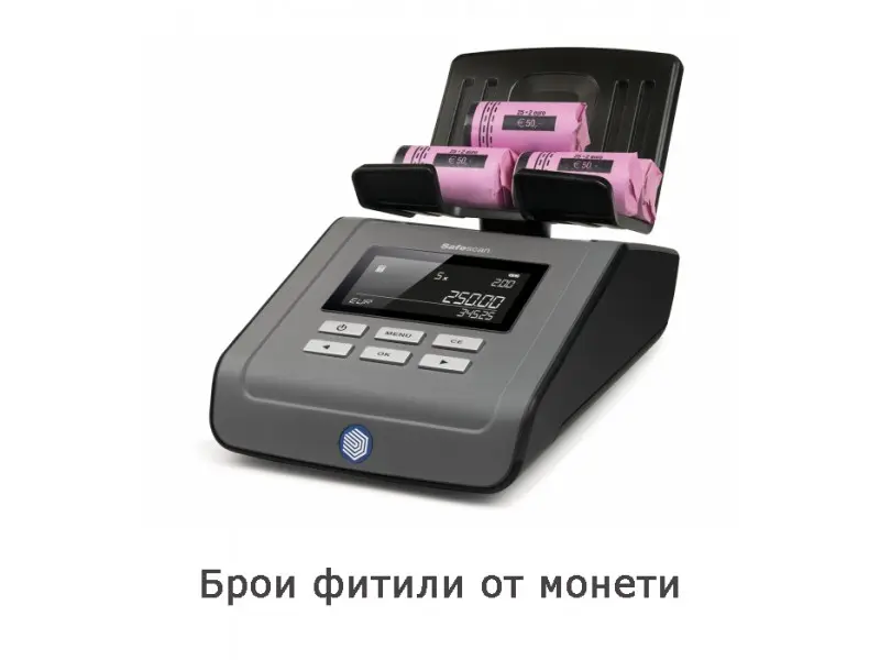 Safescan 6165 безпроблемно брои монети, банкноти, фитили от монети и пачки от банкноти от 13 различни валути. Разполага с функциите автоматично да добавя преброените монети/банкноти към общата сума и автоматично да преминава към следващата номинална стойност, след като премахнете монетите/банкнотите от платформата. В допълнение може да зададете начална сума, която винаги да имате в касата и след това машината автоматично ще я приспадне от общата преброена сума.