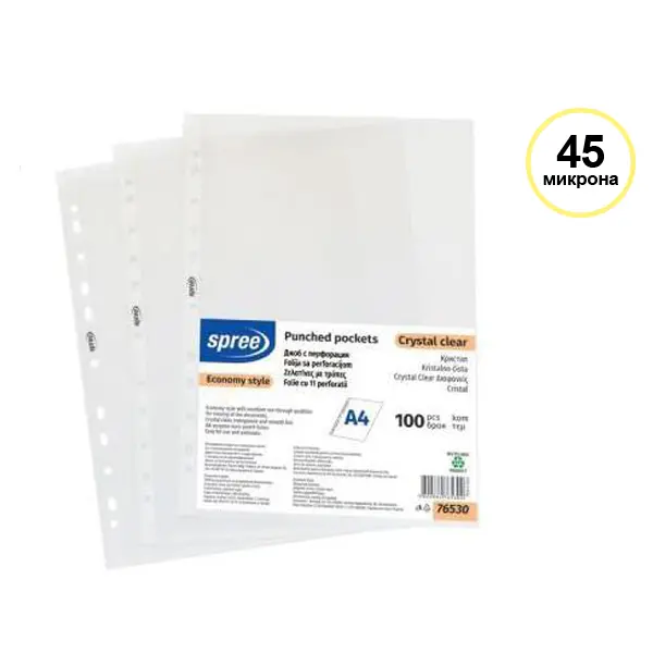 Джобът е подходящ за всички папки и класьори, защото притежава универсална перфорация. за документи А4 кристал 45 микр 100 бр