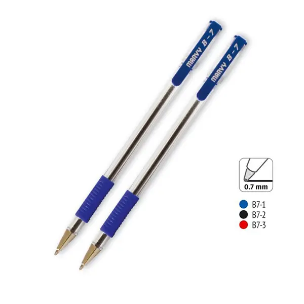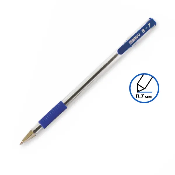 Химикалка Marvy Uchida B7 грип синя има прозрачен корпус, даващ възможност за следене нивото на мастилото. Цветът на капачката отговаря на цвета на мастилото.