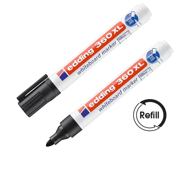 Маркерът за бяла дъска Edding E-360XL черен е подходящо за писане върху бяла дъска, стъкло, керамика и други. Може да се презарежда с помощта на мастилото Edding ВТ30.