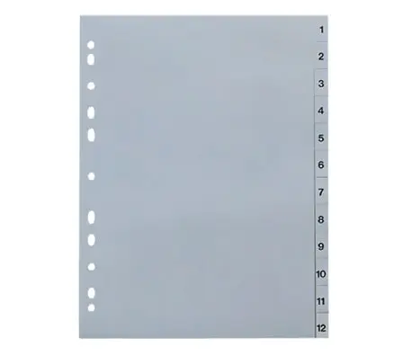 Разделителят 1-12 PP сив е подходящ за разделяне на отделни видове документи или теми. Притежава перфорация за поставяне в класьор или папка, което го прави подходящ за употреба в офиса и дома.