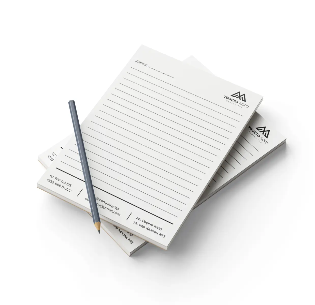 Блокнотите са незаменим помощник в ежедневието – както в офиса, така и у дома. Те са идеални за водене на бележки, записки от срещи, задачи, идеи или като фирмени подаръци с персонален дизайн. Предлагаме изработка на блокноти по индивидуален проект или по готов файл.