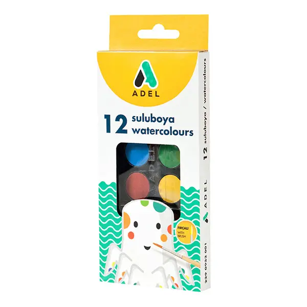 Бои акварелни Adel Ф30 са в удобна пластмасова кутия с 12 таблетки в ярки цветове. В комплекта има включена четка. Цветовете са с отлична плътност и лесни за смесване за още по-голяма забава на малките художници.