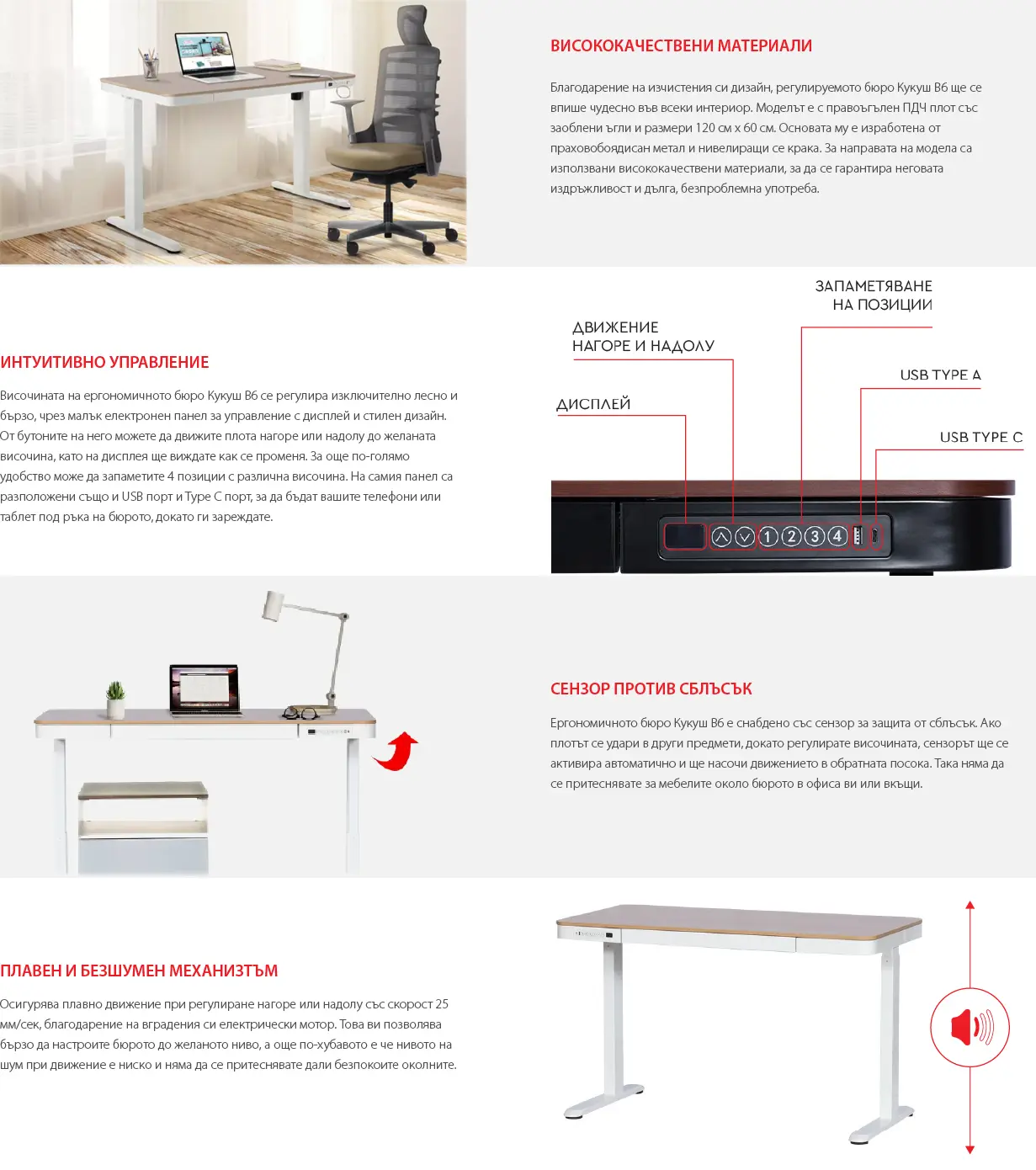 Бюро регулируемо КУКУШ B6 е регулируемо с променлива височина от 72 до 121 см и възможност за запаметяване на 4 различни позиции. To е снабденo със сензор против сблъсък, 1 USB порт, 1 Type C порт и удобно чекмедже под плота.