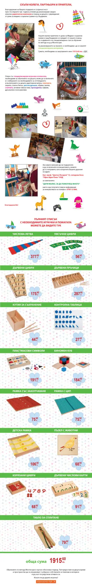 Дарителска кампания за оборудване на зала за Монтесори обучение