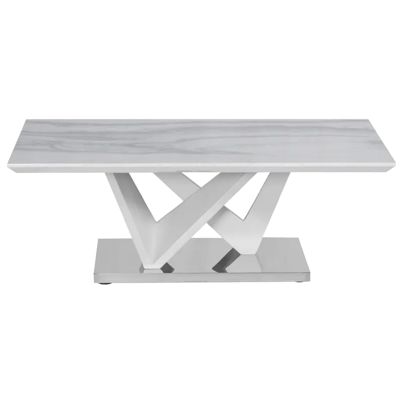 Холна маса ИНДИАНА е модел с разчупена основа и правоъгълен плот с шарка, наподобяваща мрамор. Изработена е от висококачествени материали – МДФ с гланц покритие и неръждаема стомана.