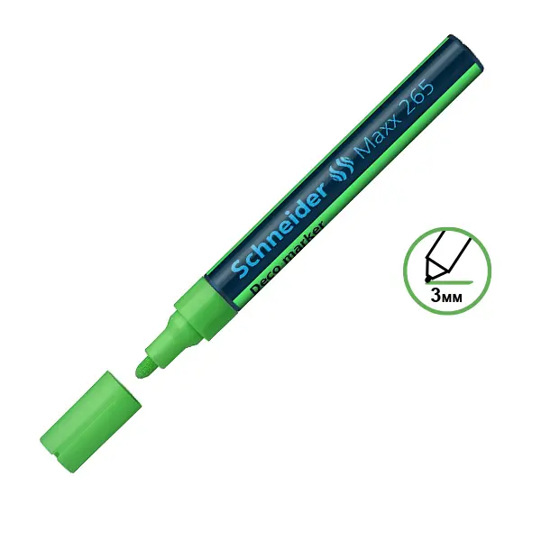 Маркерът тебешир Schneider Maxx 265 светлозелен е подходящ за надписване и декориране на прозорци и други затворени повърхности. Изключително лесно се почиства от гладки повърхности само с помощта на влажна кърпа. В същото време не се изтрива от грапави и абсорбиращи повърхности.