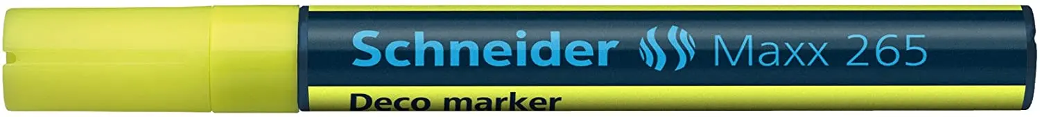 Маркерът тебешир Schneider Maxx 265 жълт е подходящ за надписване и декориране на прозорци и други затворени повърхности. Изключително лесно се почиства от гладки повърхности само с помощта на влажна кърпа. В същото време не се изтрива от грапави и абсорбиращи повърхности.
