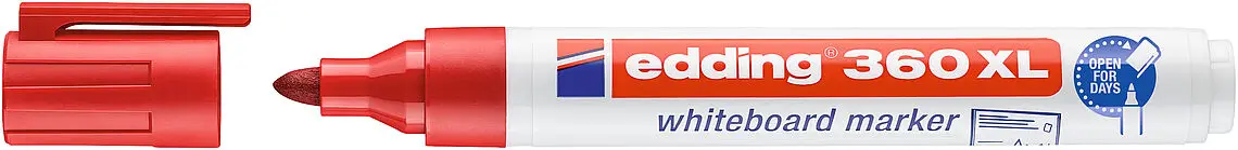 Маркерът за бяла дъска Edding E-360XL червен е подходящо за писане върху бяла дъска, стъкло, керамика и други. Може да се презарежда с помощта на мастилото Edding ВТ30.