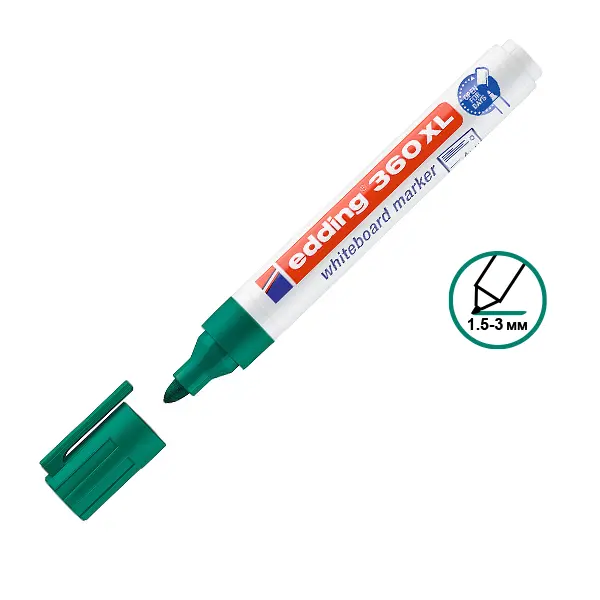 Маркерът за бяла дъска Edding E-360XL зелен е подходящо за писане върху бяла дъска, стъкло, керамика и други. Може да се презарежда с помощта на мастилото Edding ВТ30.