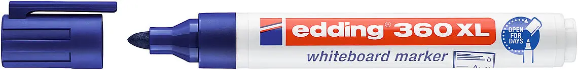 Маркерът за бяла дъска Edding E-360XL син е подходящо за писане върху бяла дъска, стъкло, керамика и други. Може да се презарежда с помощта на мастилото Edding ВТ30.