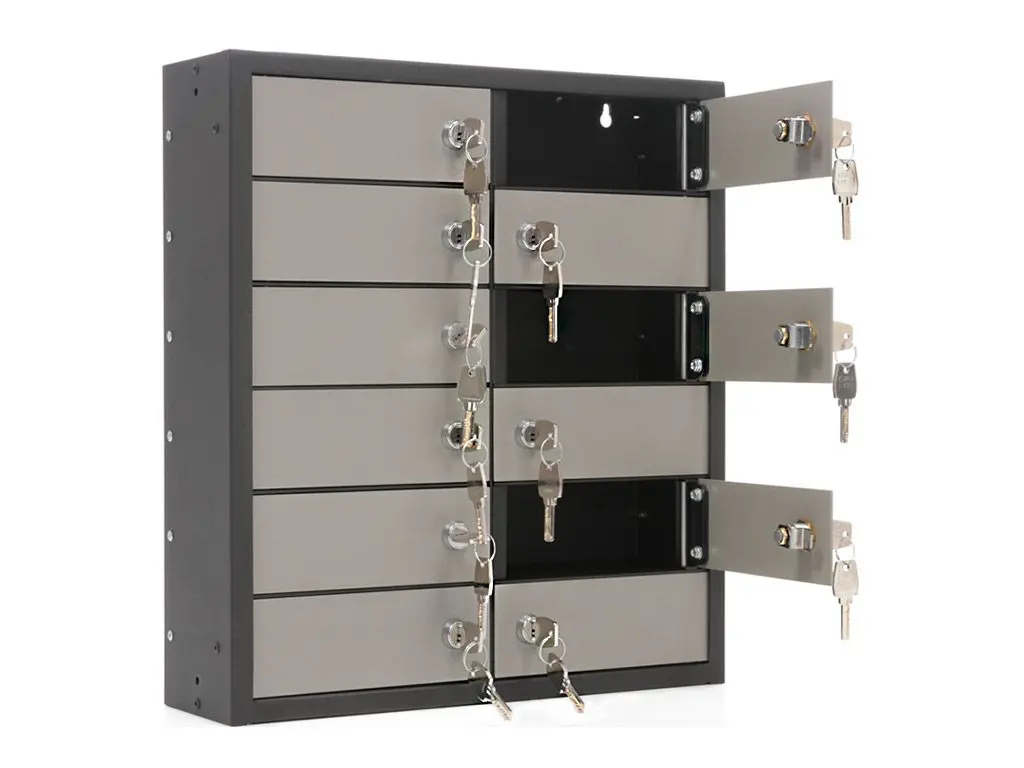 Металният шкаф DBI PMT 12 е подходящ за съхранение на лични вещи, мобилни телефони и документи за учреждения с ограничен достъп. Разполага с 12 индивидуални клетки.
