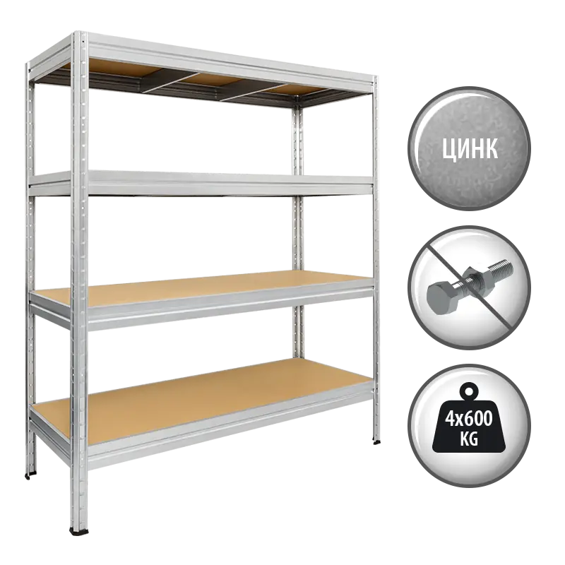 Метален стелаж BTL цинк е стабилен стелаж от галванизиран метал с размери 168x160x40 см. С негова помощ ще подредите килера или гаража у дома, както и работното си пространство. Разполага с 4 МДФ рафта, всеки от които може да издържа на максимално натоварване от 600 кг. Благодарение на безболтовия монтаж височината на рафтовете може да бъде лесно регулирана и променяна.