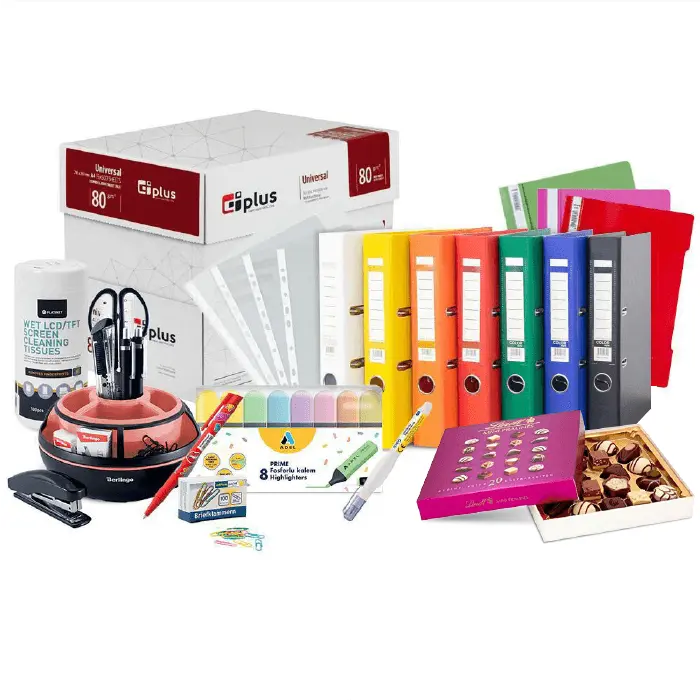 Само сега може да се възползвате от неустоимото ни предложение за канцеларски материали. Със закупуването на офис комплекта с подарък вие ще получите копирна хартия, класьори, PVC папки, джобове за документи, кламери, химикалки, текст маркери, коректор, цветно кубче, органайзер за бюро и кърпички за почистване на монитори. В допълнение ще Ви дадем подарък кутия мини пралини Lindt 20 броя бонбони 100 г.