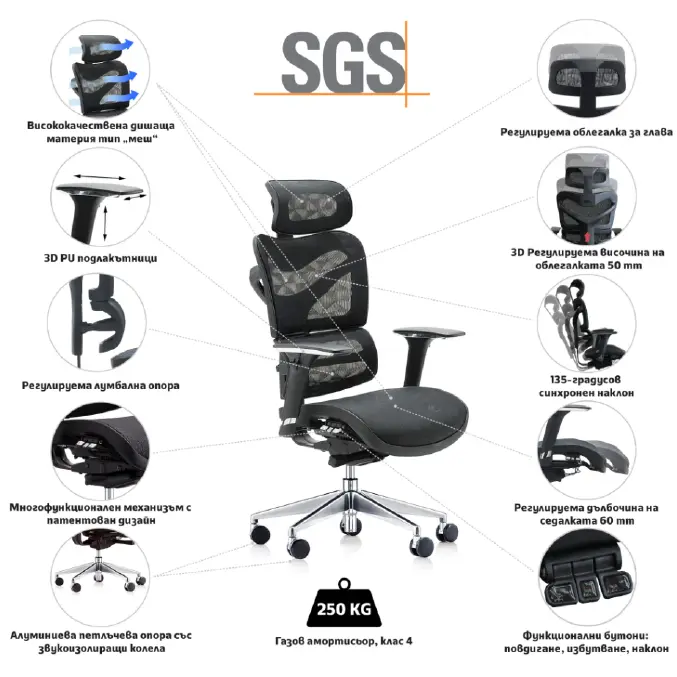 Работен стол ХЕРМЕС е ергономичен офис стол, които впечатляват с модерен дизайн, удобство и функционалност. Създаден за хора, които прекарват над 8 часа в седнало положение, този стол предлага индивидуално настройване за максимален комфорт. Регулируема дълбочина на седалката и височина на облегалката, идеални за всеки ръст. 3D подлакътници и регулируема опора за глава за допълнително удобство.
