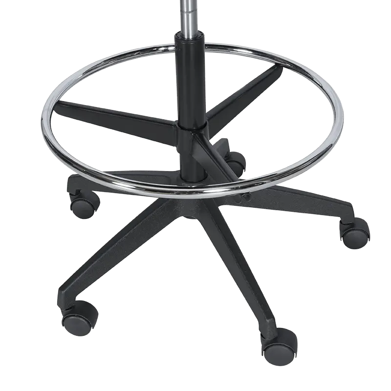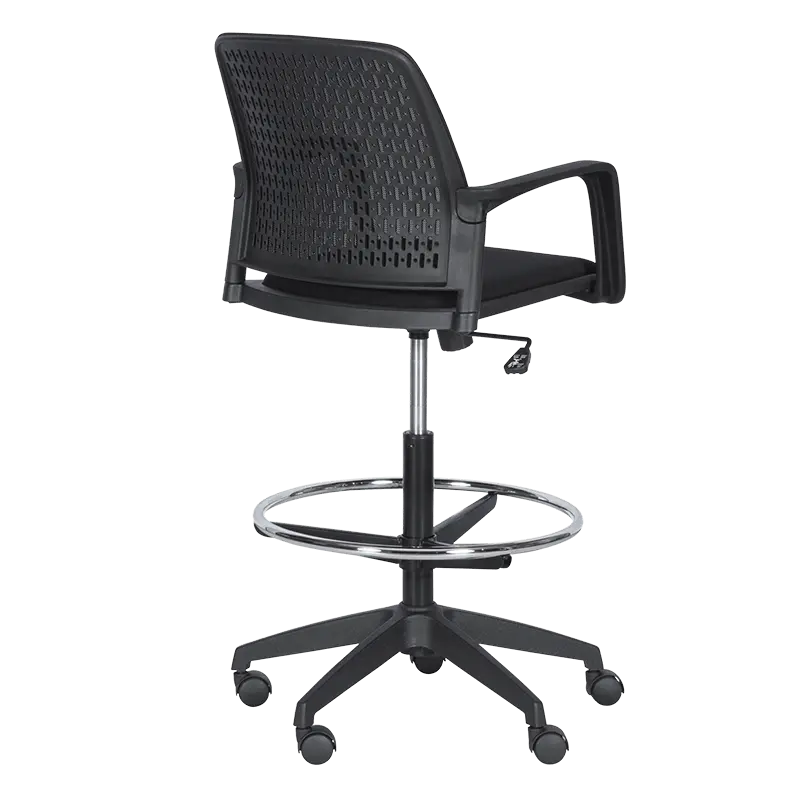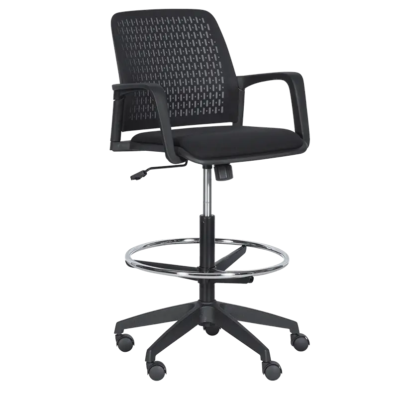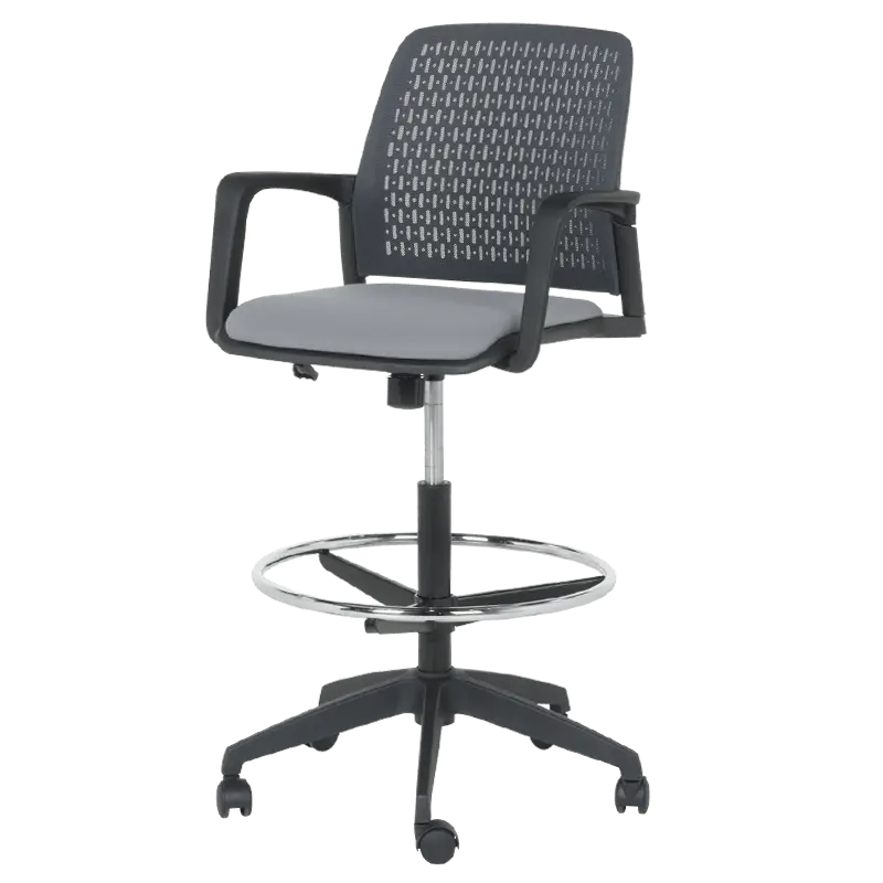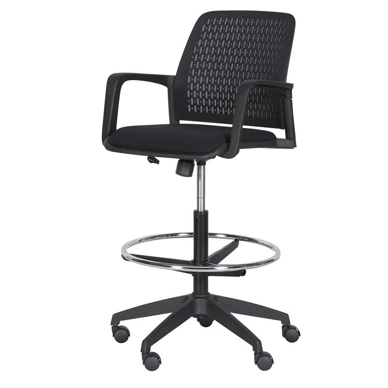 Работен стол ТРЕНДО комбинира функционалност и комфорт. Благодарение на регулируемата си височина и хромирана степенка тип ринг, той може да се използва както като обикновен офис стол, така и като висок работен стол. Степенката осигурява удобна опора за краката и предпазва от неприятното усещане за „висящи“ крака при по-висока позиция на седалката. Седалката е тапицирана с дамаска, а облегалката е изработена от полипропилен с мрежеста структура за по-добра вентилация и циркулация на въздуха.