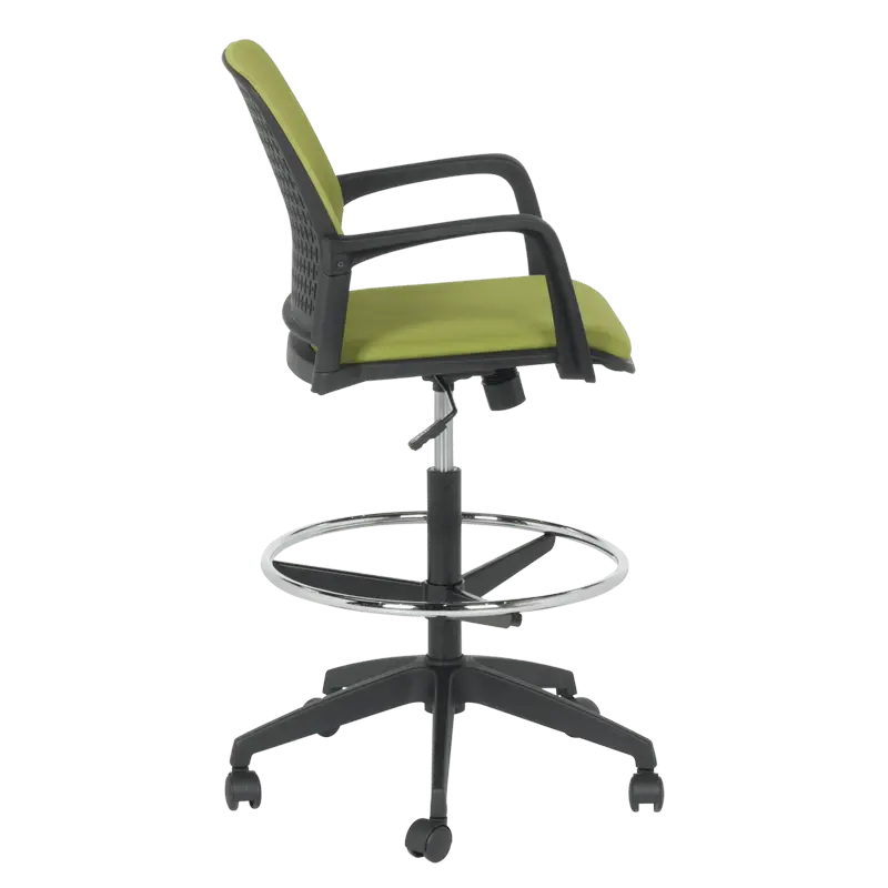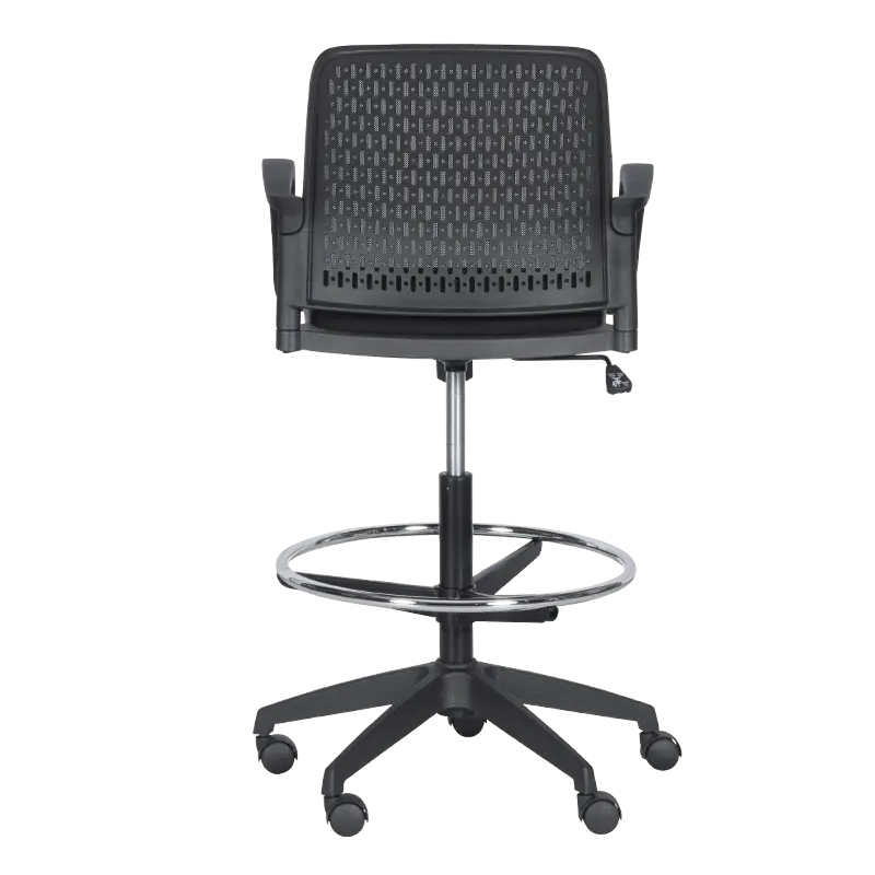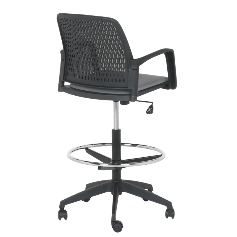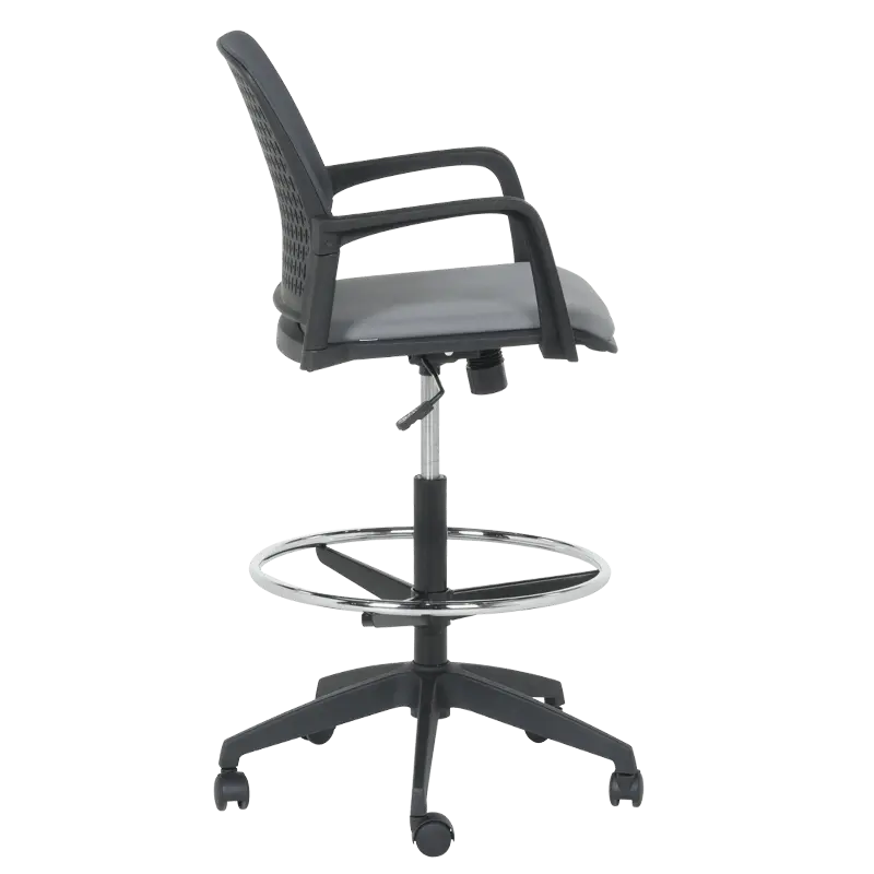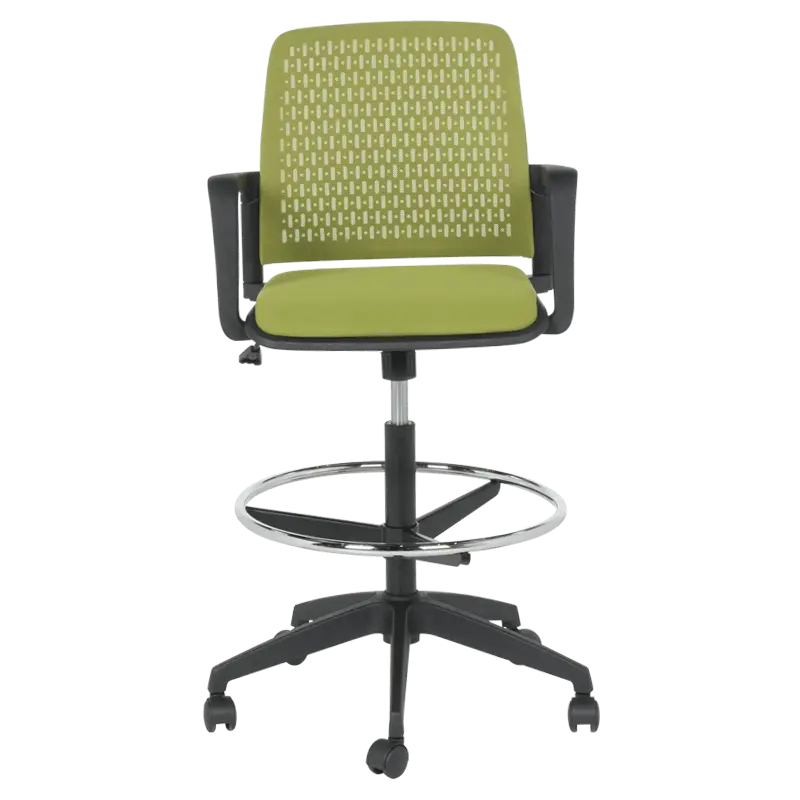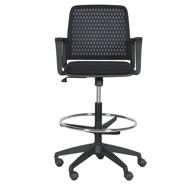 Работен стол ТРЕНДО комбинира функционалност и комфорт. Благодарение на регулируемата си височина и хромирана степенка тип ринг, той може да се използва както като обикновен офис стол, така и като висок работен стол. Степенката осигурява удобна опора за краката и предпазва от неприятното усещане за „висящи“ крака при по-висока позиция на седалката. Седалката е тапицирана с дамаска, а облегалката е изработена от полипропилен с мрежеста структура за по-добра вентилация и циркулация на въздуха.