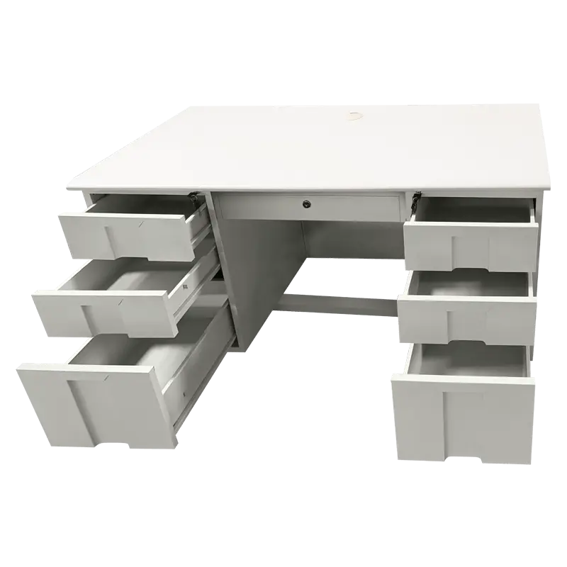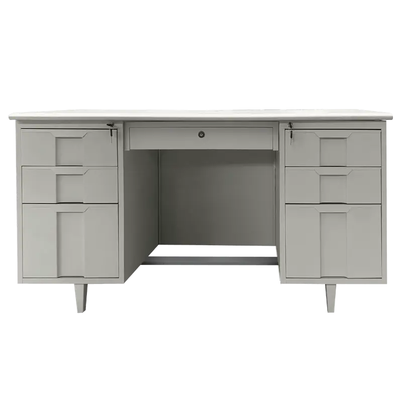 Работно бюро BTL 120 L съчетава практичност, сигурност и стилна визия в светлосиво покритие. Конструкцията е изработена от праховобоядисан метал с гладко покритие, а плотът е от ПДЧ с дебелина 25 мм и вграден отвор за кабели. Моделът разполага с общо 7 чекмеджета – три отляво, три отдясно и едно централно под плота – с възможност за заключване.