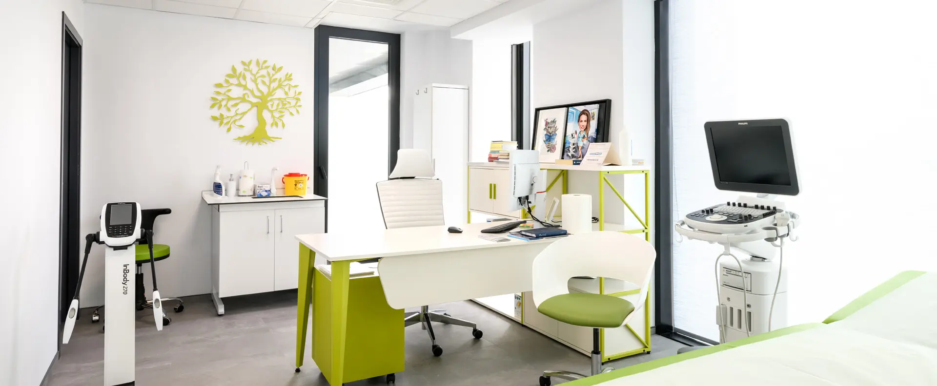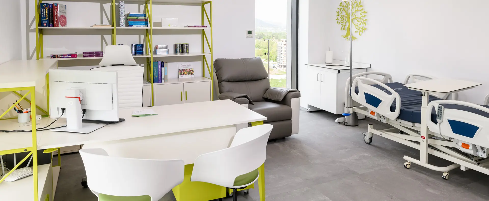 Цветовата концепция е изградена така, че да съчетае усещането за спокойствие с нотка свежест, която оживява пространството. Базовата визия на интериора залага на бялото - символ на чистота, лекота и професионализъм. В нея естествено се вписаха и нашите столове в бяло и свежо зелено, подбрани така, че да усилят усещането за грижа, спокойствие и природна лекота. Зеленото не просто внася цвят, то носи послание: за баланс, обновяване и здраве.