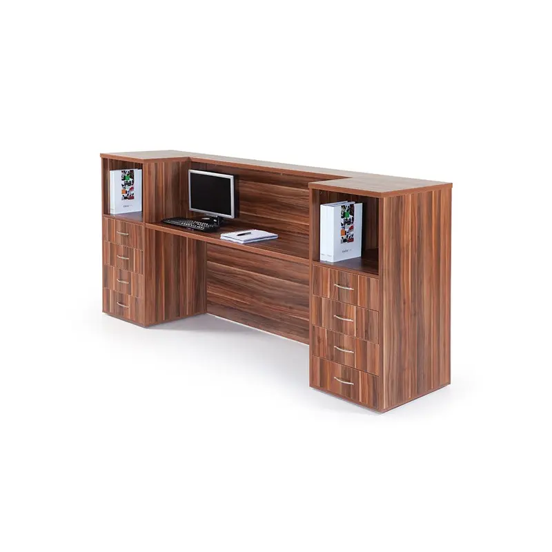 Рецепция GM 1045 е елегантна рецепция, изработена от ПДЧ, с гладко и матово покритие, което му придава модерен и изискан характер. Топлите цветове на дървото допълват изчистените линии на дизайна, осигурявайки професионален и привлекателен външен вид. Просторната му повърхност предоставя достатъчно място за работа, а скритото съхранение спомага за поддържане на реда и организацията. Идеален избор за създаване на приветливо първо впечатление във всяка модерна офисна среда.