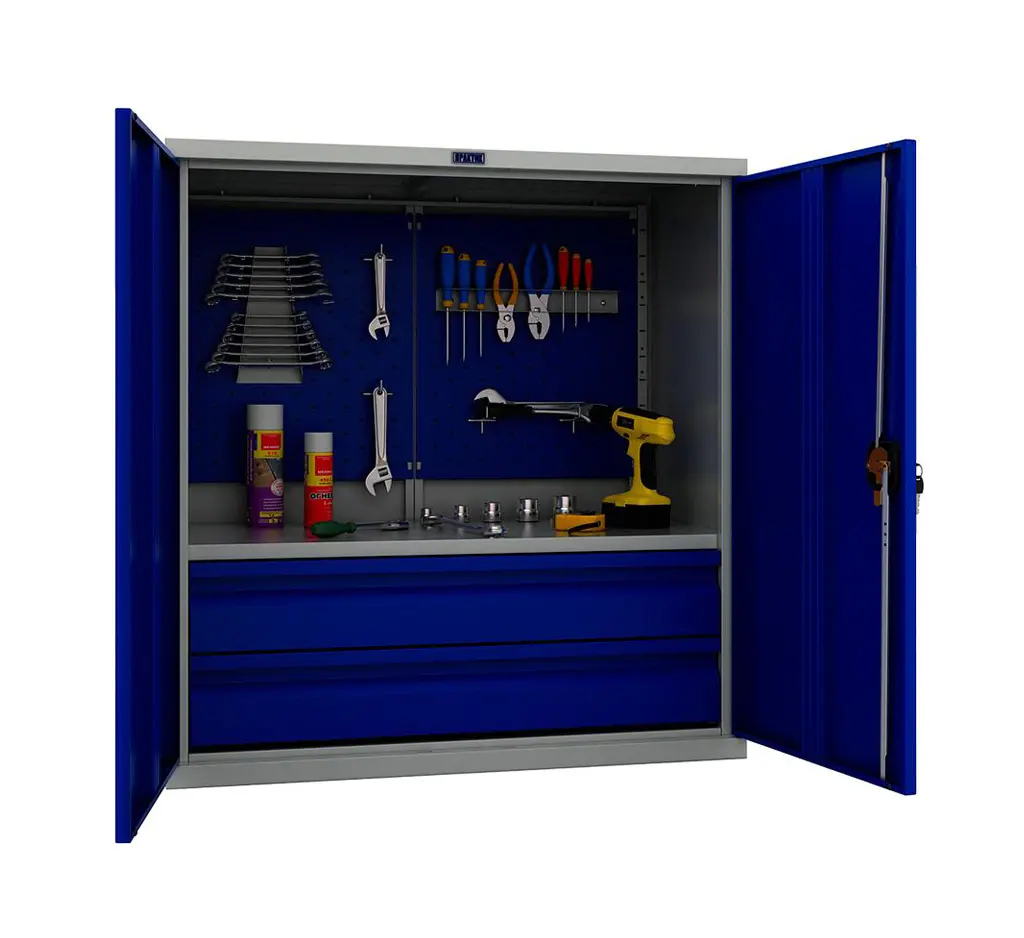 Шкафът PMT 1095 е предназначен за съхранениe на материали, консумативи и инструменти в производствени предприятия, автосервизи и ремонтни работилници. Включва две чекмеджета, един рафт и два екрана за закачане на инстументи.