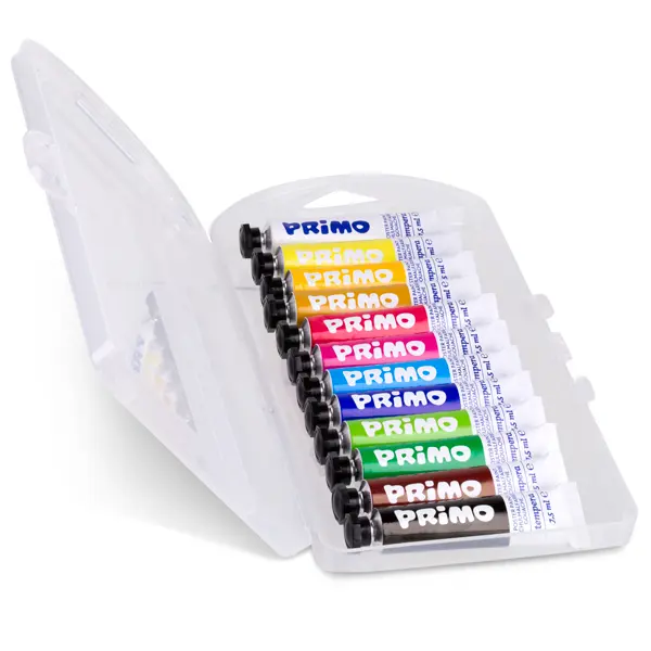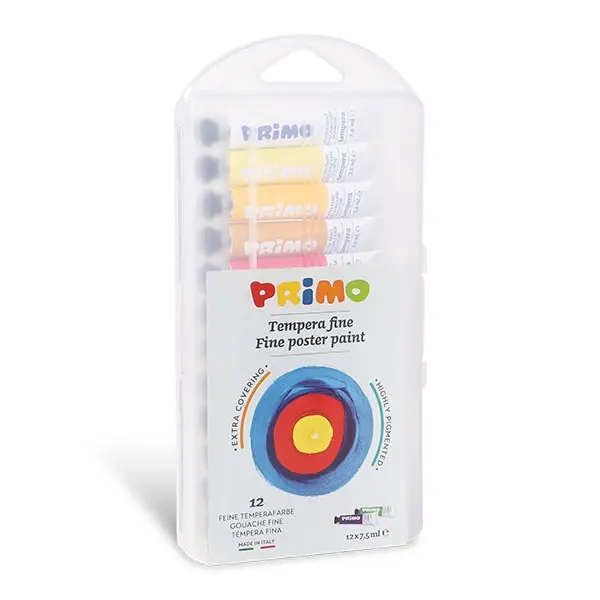 Primo ви представя 12 неотразими цвята темперни бои, с които да озарите всяка ваша картина. Внесете собствен стил във вашите творения с комбинацията от неонови и метални цветове. Алуминиевите тубички са лесни за използване, а кутията, в която се намират, ви позволява да ги вземете навсякъде, за да ги покажете на вашите приятели.