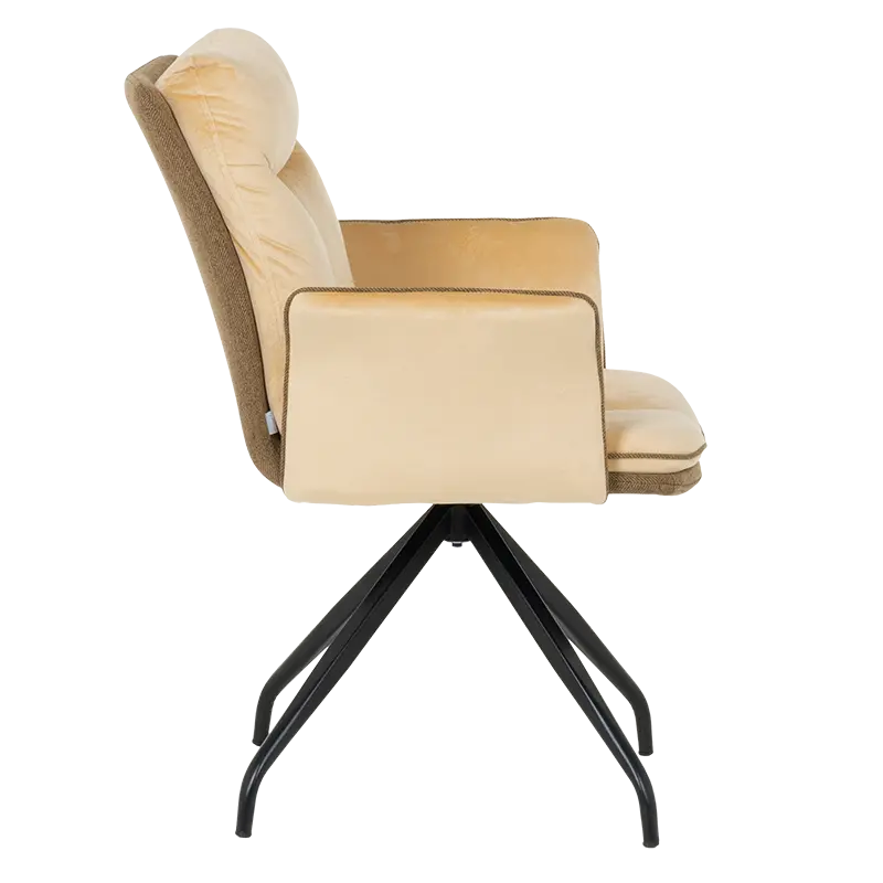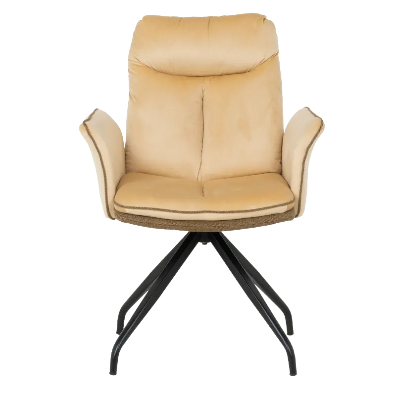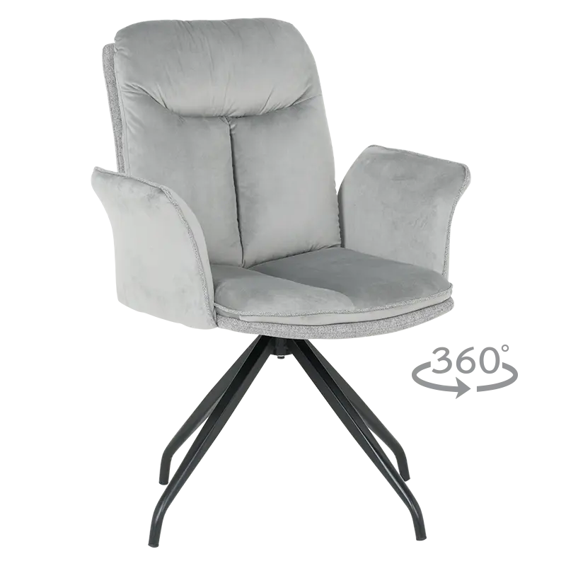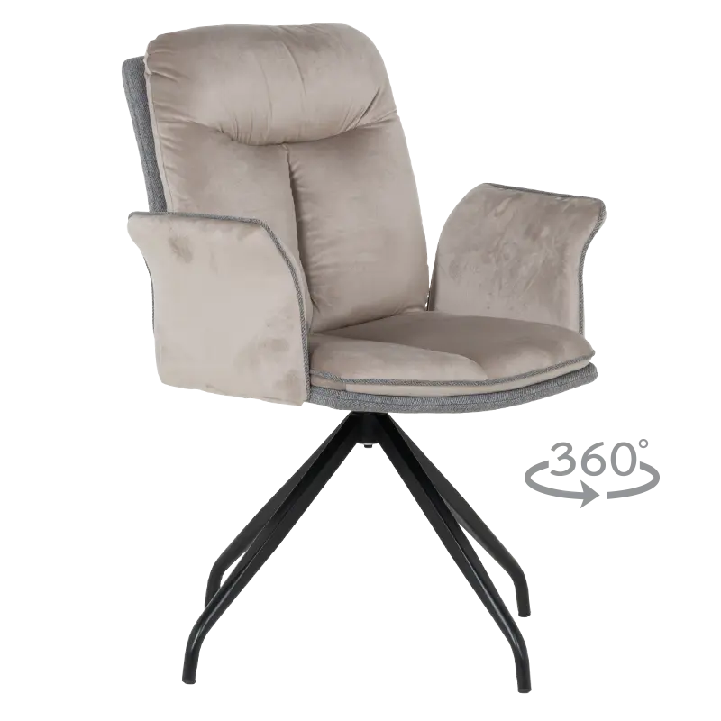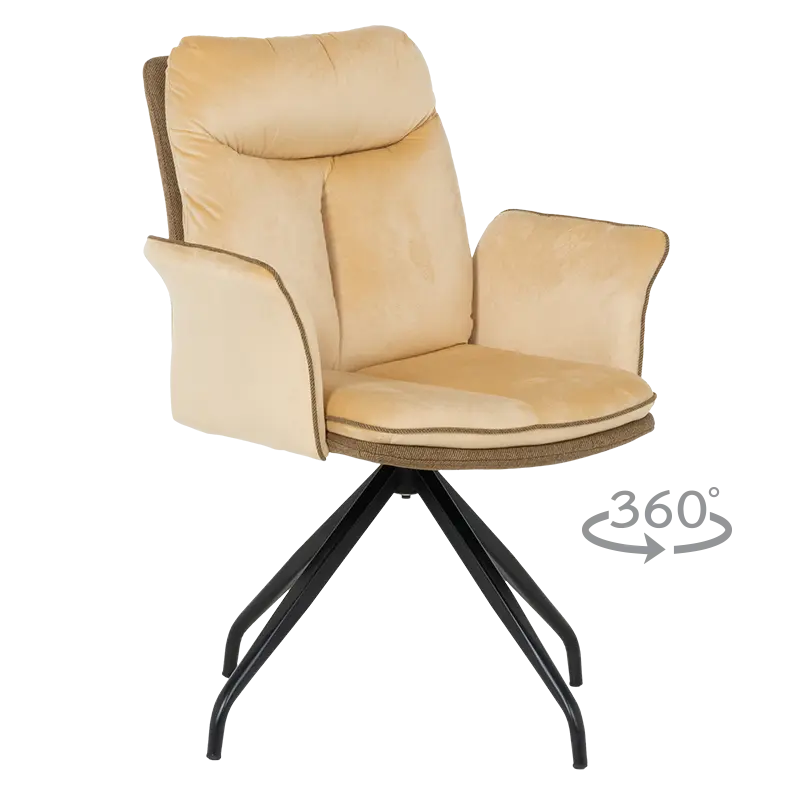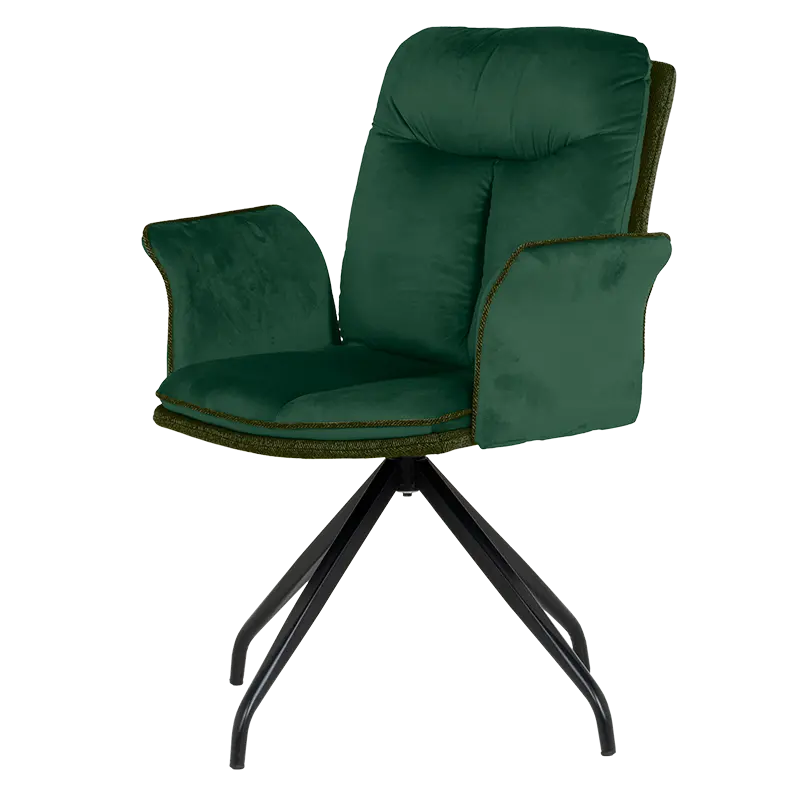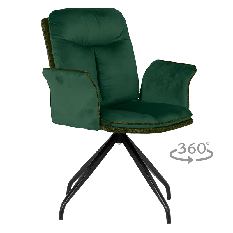 Трапезен стол КРАСЕН е трапезен стол с модерна визия. Той има широки седалка и облегалка от дамаска, с допълнителни възглавници за максимално удобство. Подлакътниците повишават комфорта на седящия. Основата е метална и има иновативна функция за 360° въртене.
