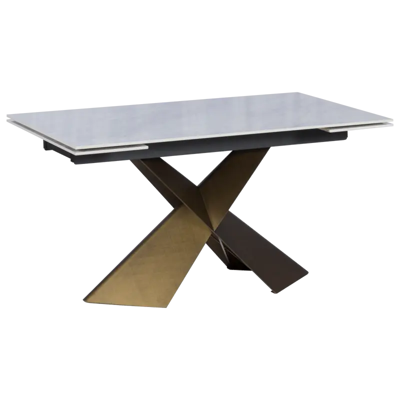 ЛЕОНА е модерна трапезна маса с масивна и нестандартна основа, изработени от праховобоядисан метал. Тя е с керамичен плот, с интересни шарки, а благодарение на механизма за разтягане ще имате повече място на трапезата, когато посрещате гости.