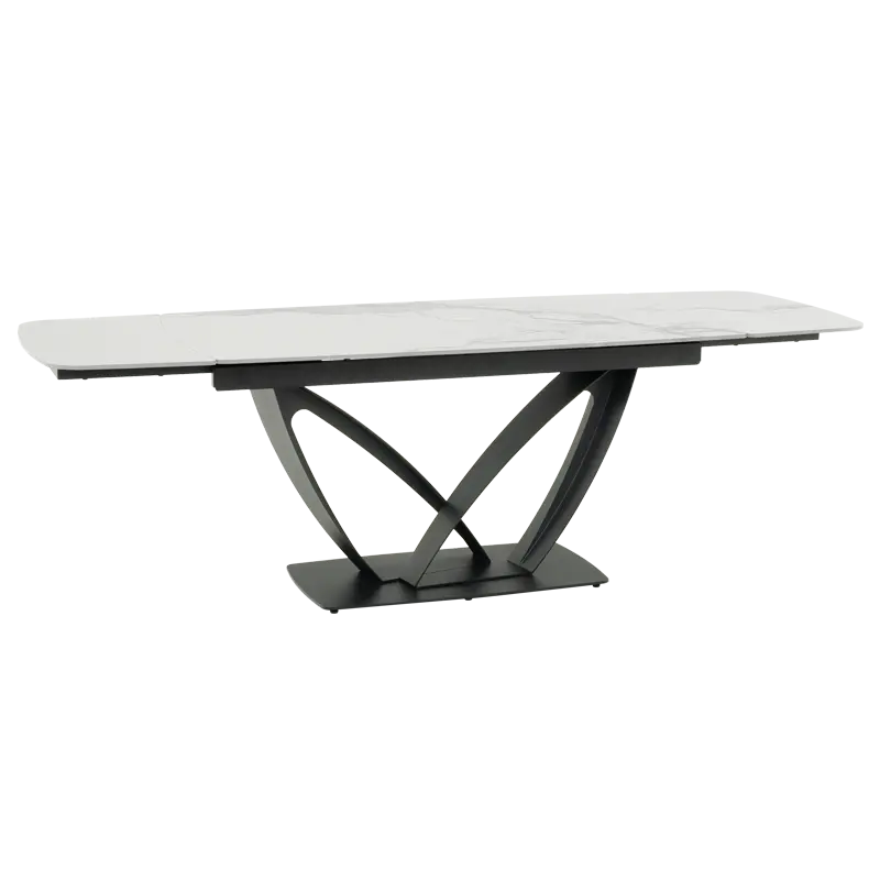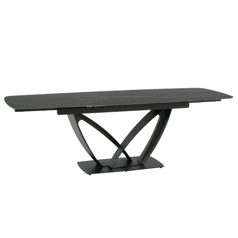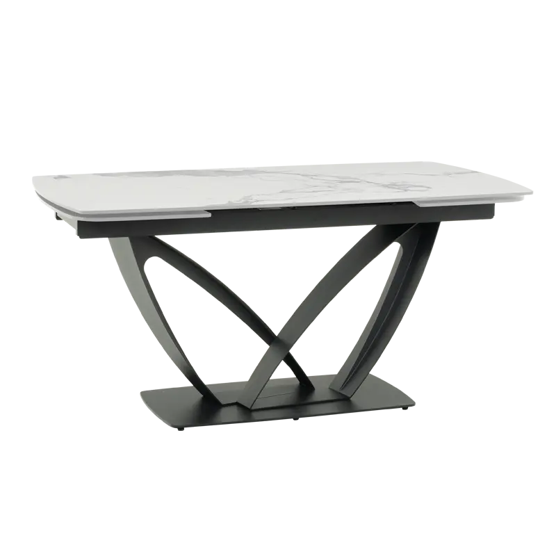 Трапезната маса ТЕМИРА е с интересна и нестандартна основа, изработена от праховобоядисан метал. Тя е с керамичен плот с шарки, наподобяващи мрамор. Благодарение на механизма за разтягане достига дължина до 240 см - така ще имате повече място, когато посрещате гости.