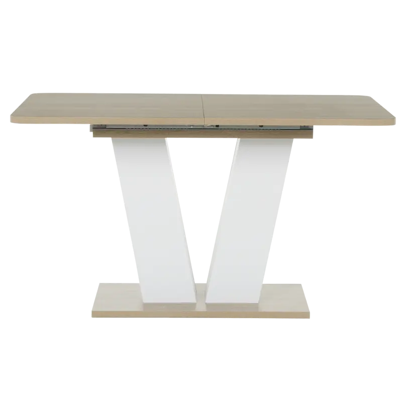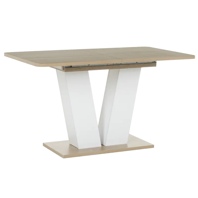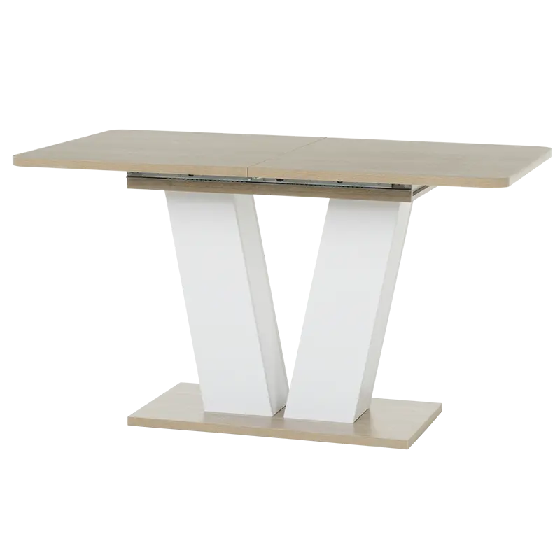 Трапезна маса ВЕГАС е модел с модерен дизайн, който ще допълни идеално всяка съвременна кухня. Масата е със стандартна височина от 75 см и нестандартна V-образна основа. Плотът е с дебелина 25 мм и размери 136х80 см, като с помощта на допълнителна плоскост може да разтегнете масата, при което дължината на плота се увеличава на 176 см.