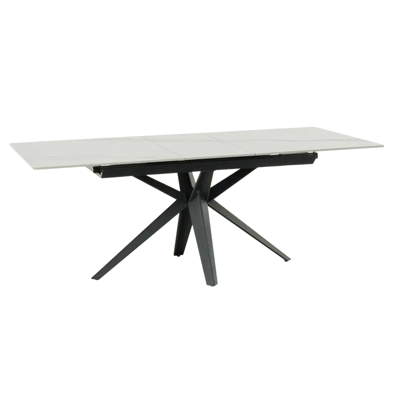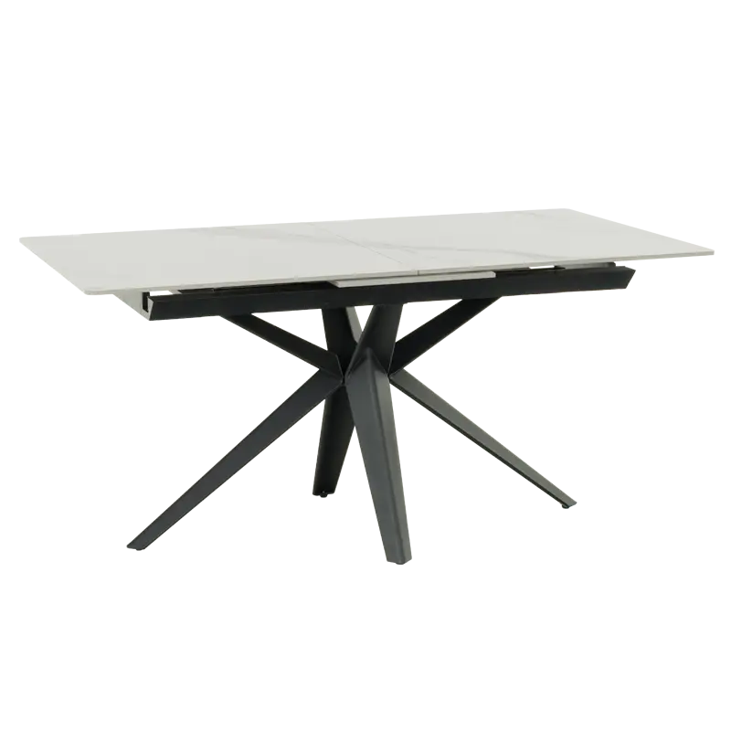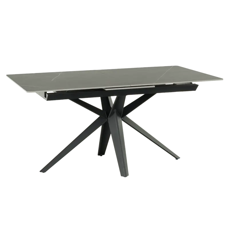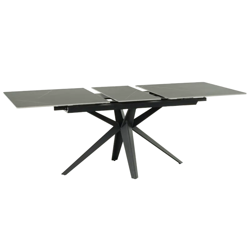 Трапезната маса ЗОРИ е с удобен разтегателен механизъм. Стилният ѝ дизайн я превръща в страхотен акцент за всеки дом. Керамичният плот е с дебелина 12 мм и със стандартен размер от 140 см, а при разтягане се удължава до 200 см. Така всеки гост или член на семейството ви ще се чувства комфортно. Разчупената метална основа осигурява стабилност и дълга експлоатация на масата.