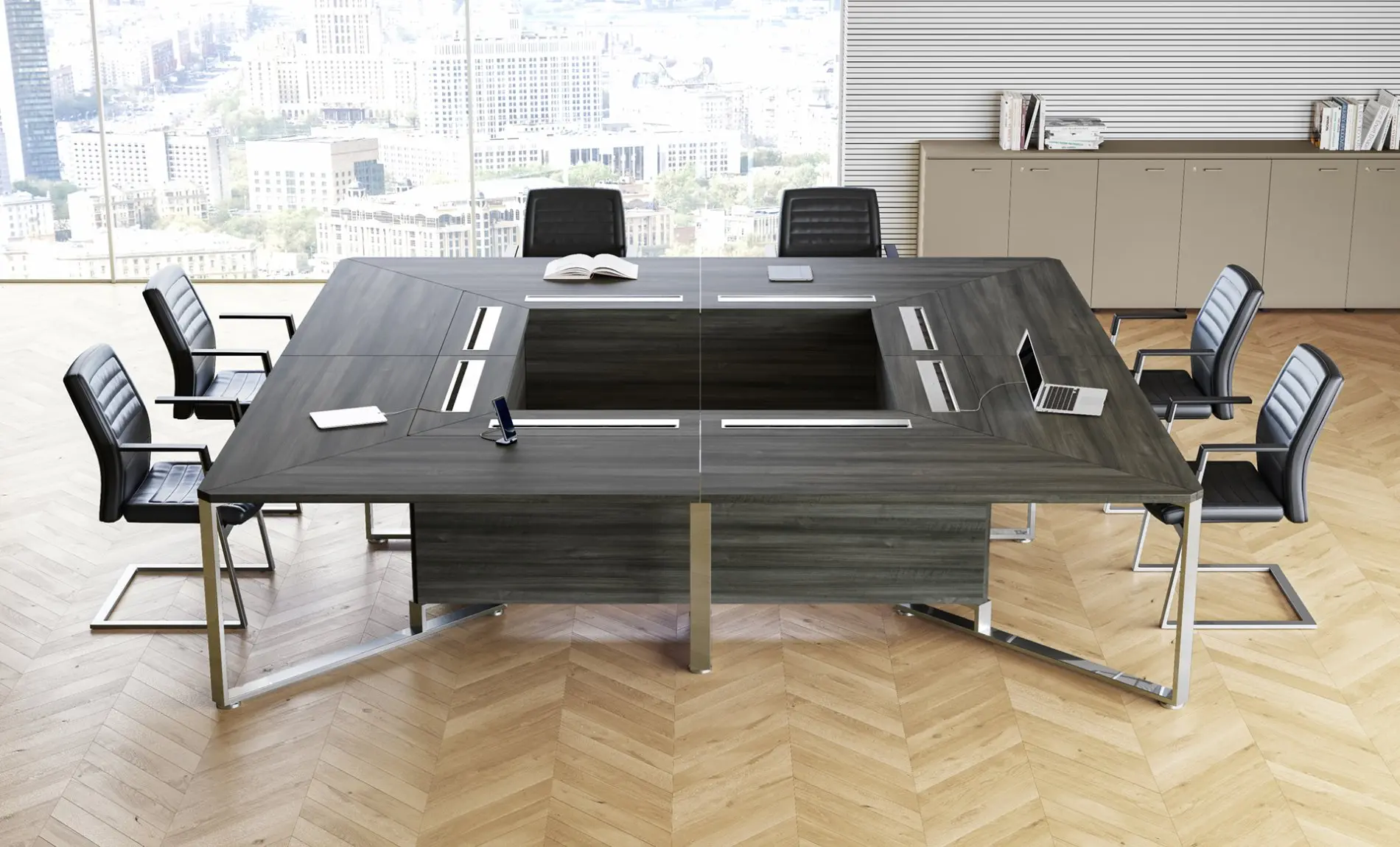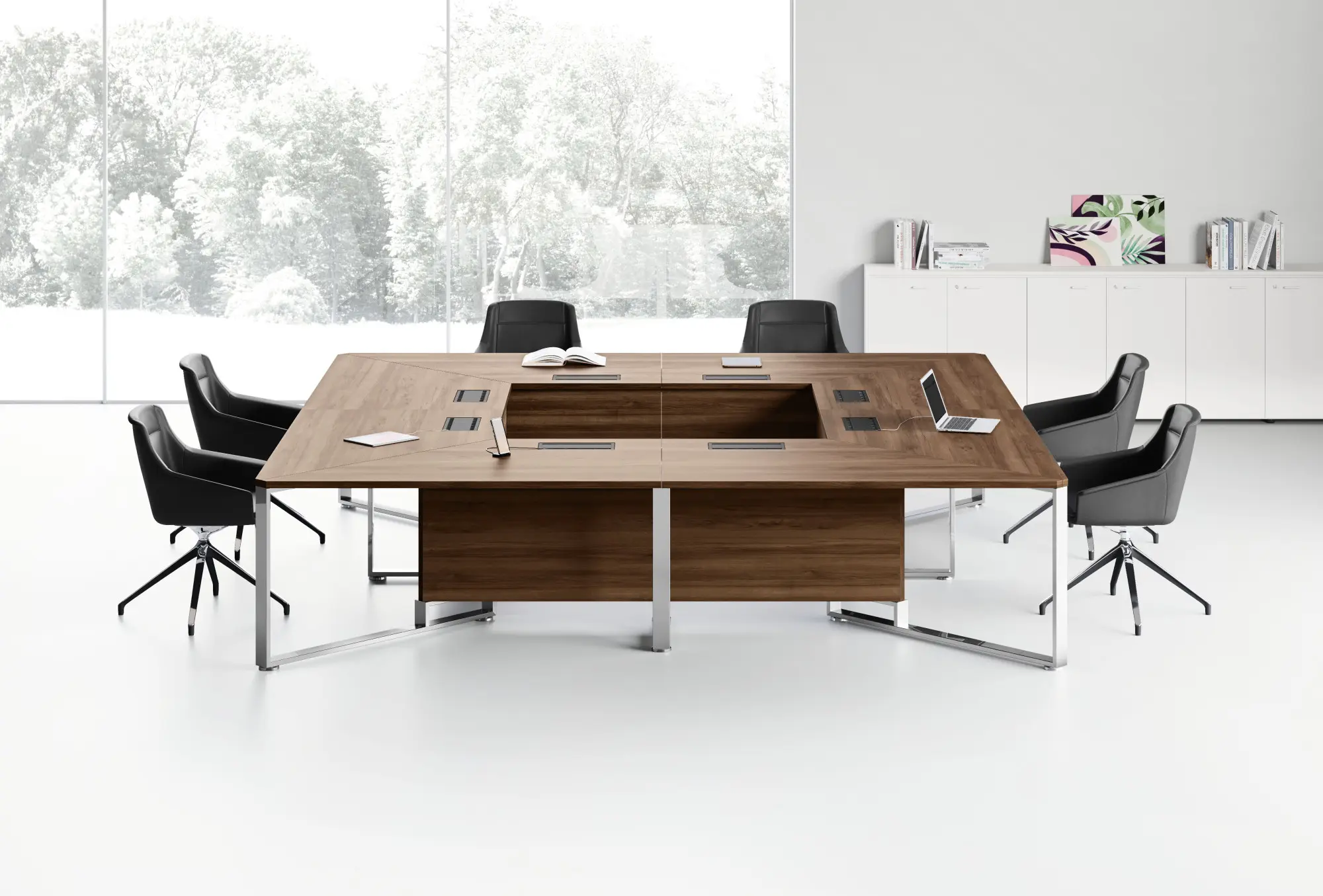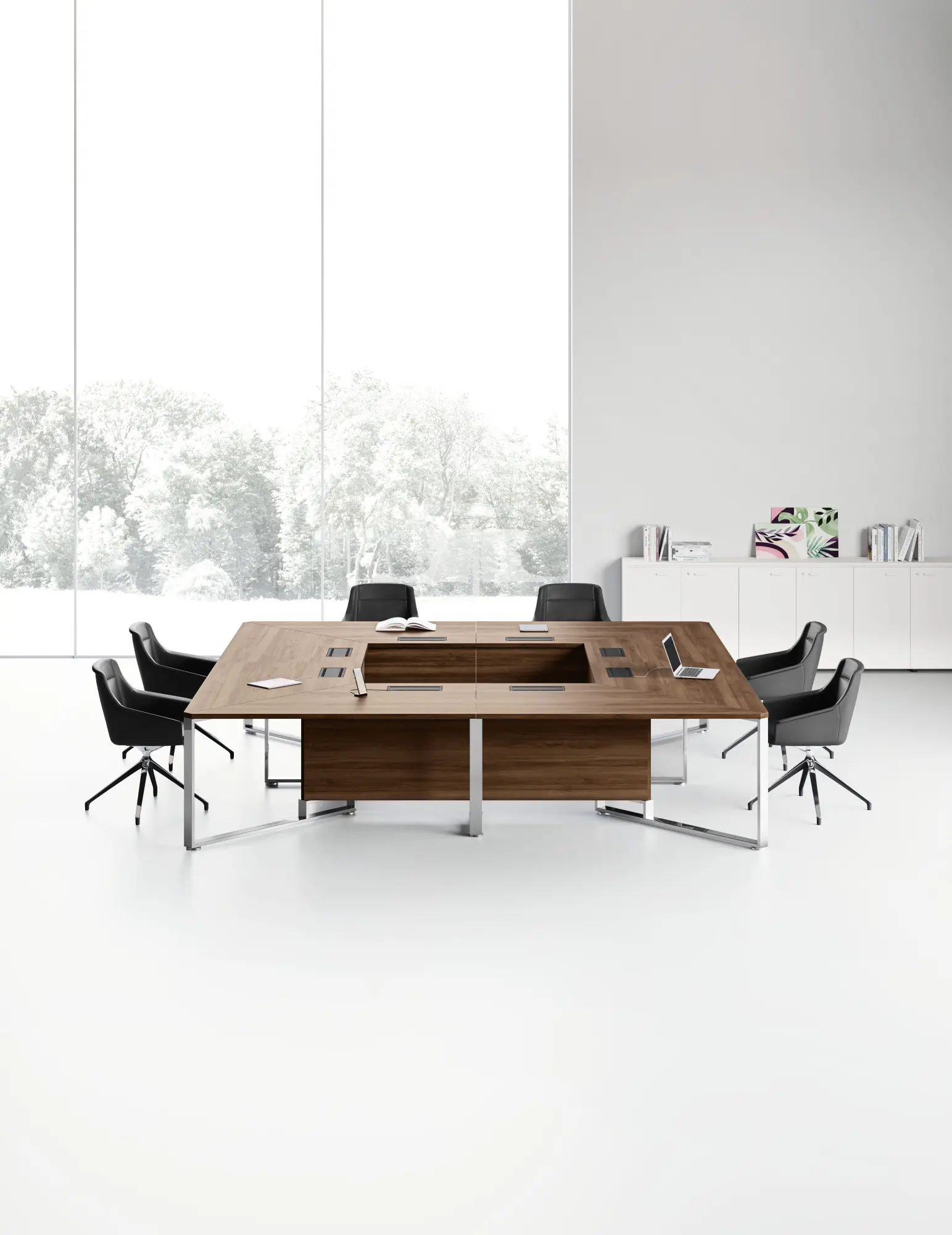 Ясните и строги дизайнерски линии и покрития, модулните форми и раздвижени решения улесняват сътрудничеството и визуалния контакт, правейки конферентните маси I-Meet идеално място за функционални и представителни срещи.