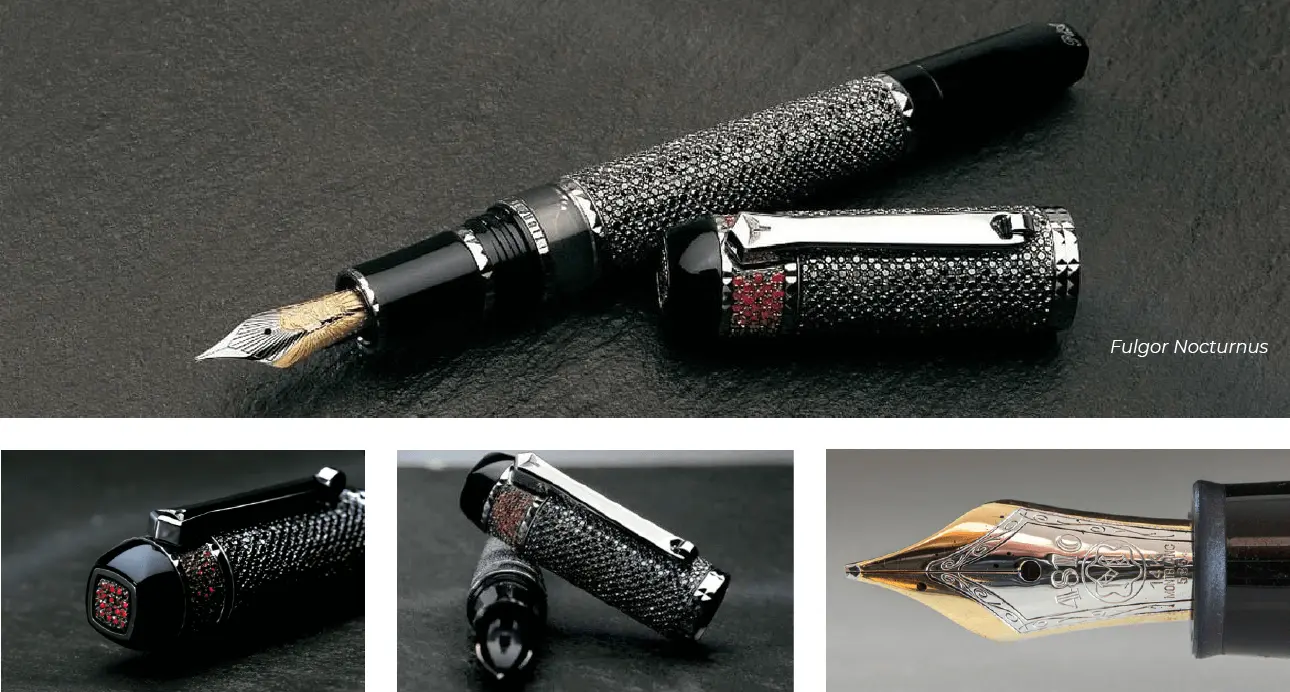 Някои компании издигат химикалката до ниво на истинско произведение на изкуството. Такъв е случаят с “Fulgor Nocturnus”: най-скъпата химикалка в света, създадена от италианската марка Tibaldi. Декорирана с рубини и диаманти, тя е продадена на търг в Шанхай за над 8 милиона долара - доказателство, че дори един обикновен предмет може да се превърне в луксозна икона.